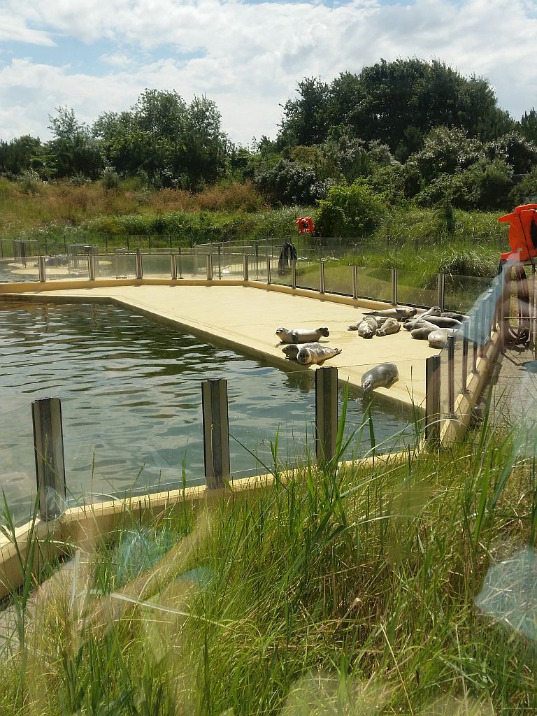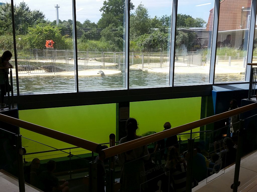 Danach zurück zu dem ursprünglichen Plan und ab nach Norddeich. Man unterschätzt ja oft die Entfernungen hier und so sind wir nur kurz vor der Seehunde-Fütterung dort angekommen. Vor der großen Scheibe am großen Becken waren viele Plätze schon besetzt …
