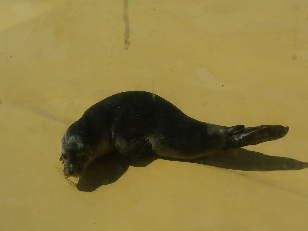 Anders war es dann bei zwei Dauergästen in der Seehundstation, die wegen Menschenprägung oder Behinderung (fehlende bzw. zu kurze Flossen) nicht ausgewildert werden können. Die hatten nur Augen für die erklärende Pflegerin. Oder ihren Fisch.