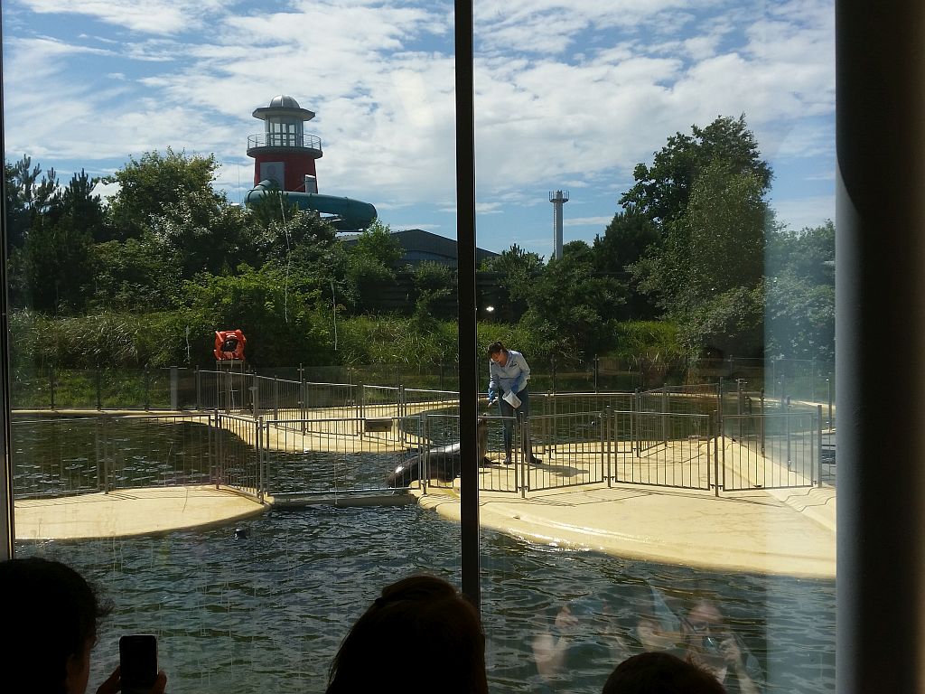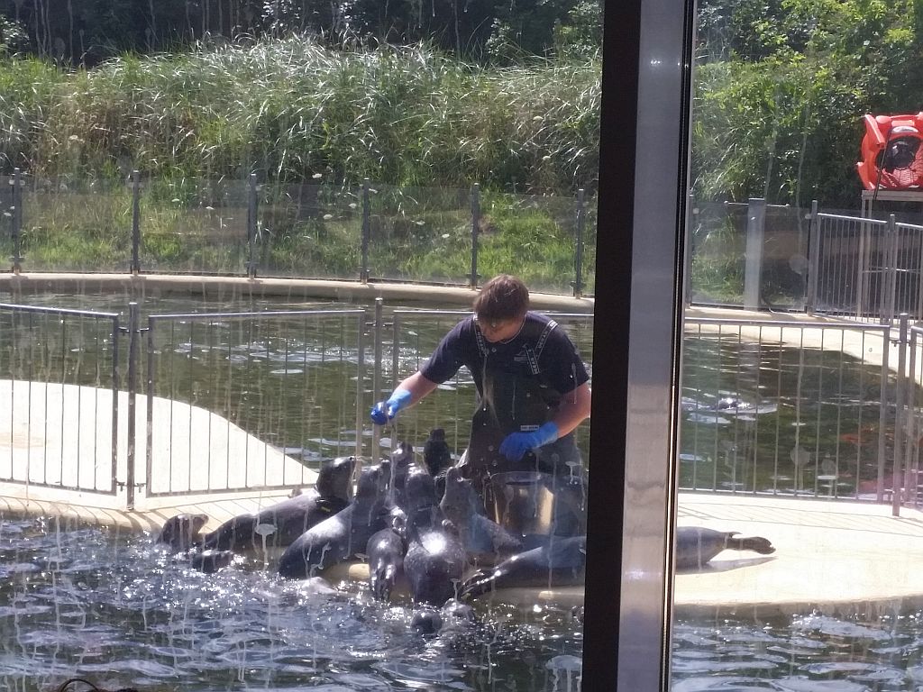 Dann Fütterung, was der Dame, die per Mikrofon die Prozedur erklären wollte, die bis dato zuhörenden Seehunde und Menschen nahm. Die Seehunde haben dann nämlich als sogenannter „Seehund-Haufen“ den Pfleger angegriffen … 😉
