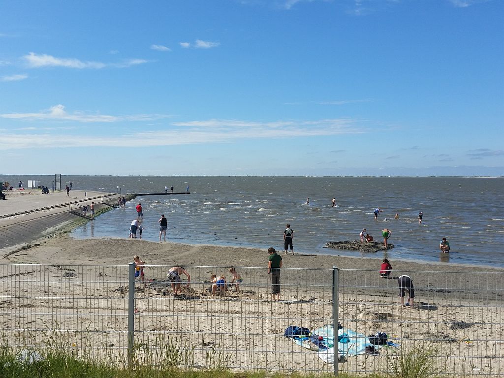 … aber an den Hafen gegangen sind, wo wir uns die Wind um die Nase haben blasen lassen. Man beachte aber auch: Kinder sind im Wasser, die verweichlichten Erwachsenen … eher nicht.