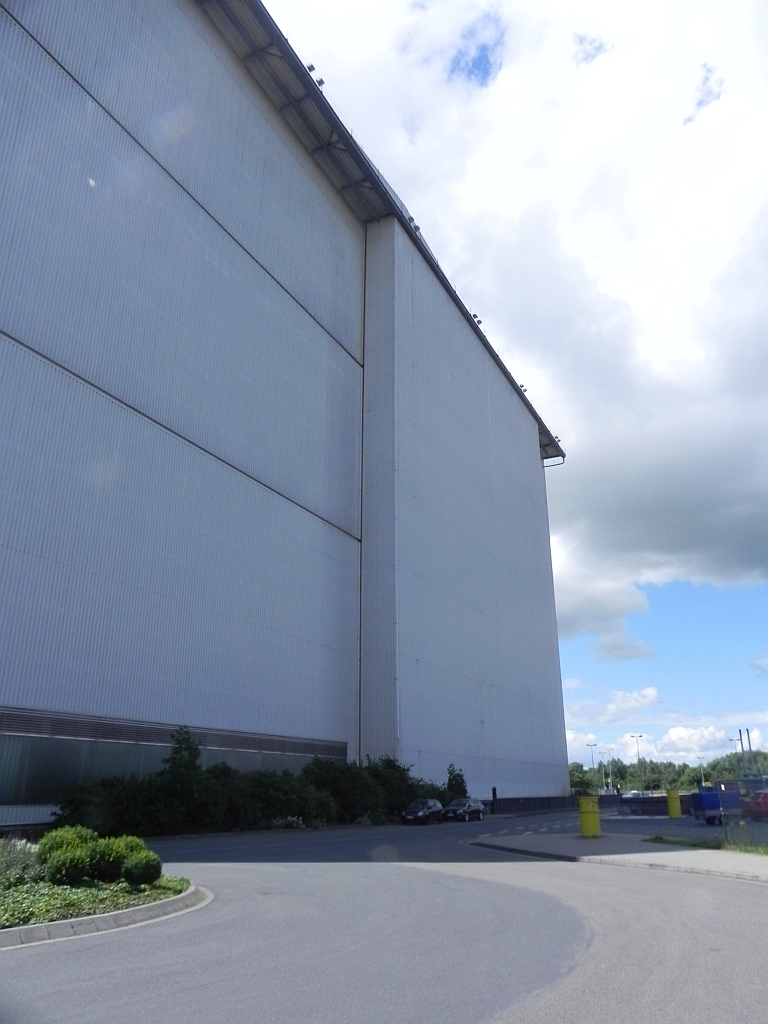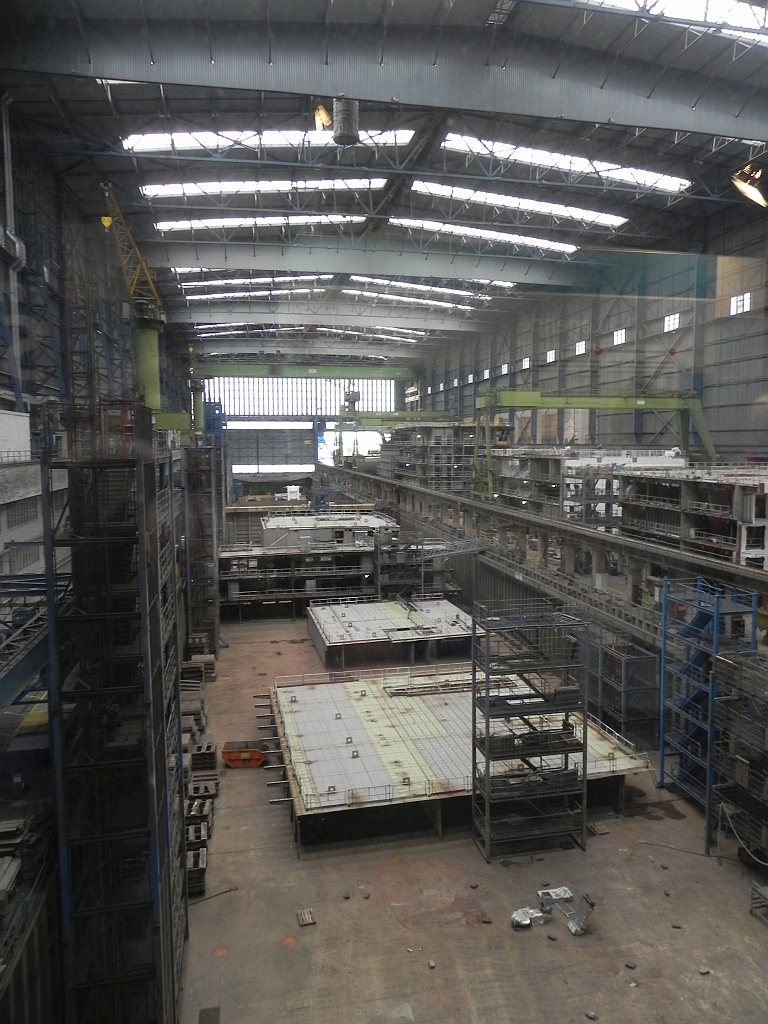Die Halle war zwar nicht so breit wie die Boeing-Werke, aber die Höhe war schon beeindruckend. Im Hafen stand auch bereits ein fertiger Mittelblock und wurde vorbereitet, dass er etwa im September zu einem Schiff vervollständigt werden kann.
