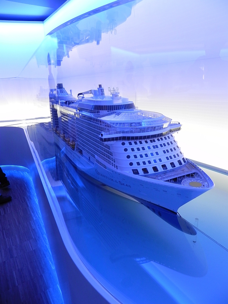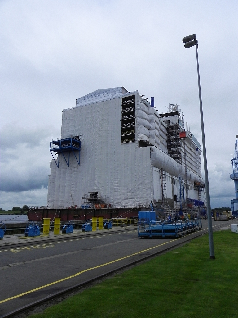 Die hier gezeigte „Quantum of the seas“ von Royal Caribbean Cruise wurde 2014 fertiggestellt (das dauert hier übrigens etwa 1,5 Jahre von Planung bis Überführung), ist im Original 347,75 Meter lang und bietet 4.188 Passagieren Platz. Das Schiff hat 167.800 BRZ (BruttoRaumZahl), was die Zahl ist, mit der man die Dimensionen eines Schiffes angibt. Momentan könnte man Schiffe bis zu einer Größe von 181.000 BRZ bauen und die Ems entlang bekommen. Diese Größe wird auch in ein paar Jahren durch die neuen „Mein Schiff“-Schiffe von TUI erreicht werden. Im übrigen hat die Werft Aufträge bis 2023 im Umfang von 16 Schiffen für AIDA, Mein Schiff, Disney, Royal Caribbean und Dream Cruises aus China.