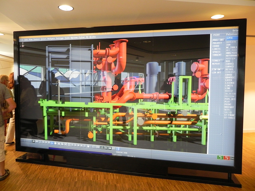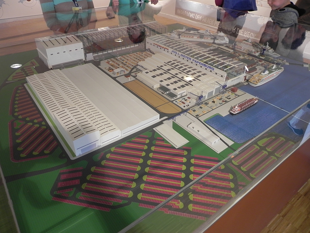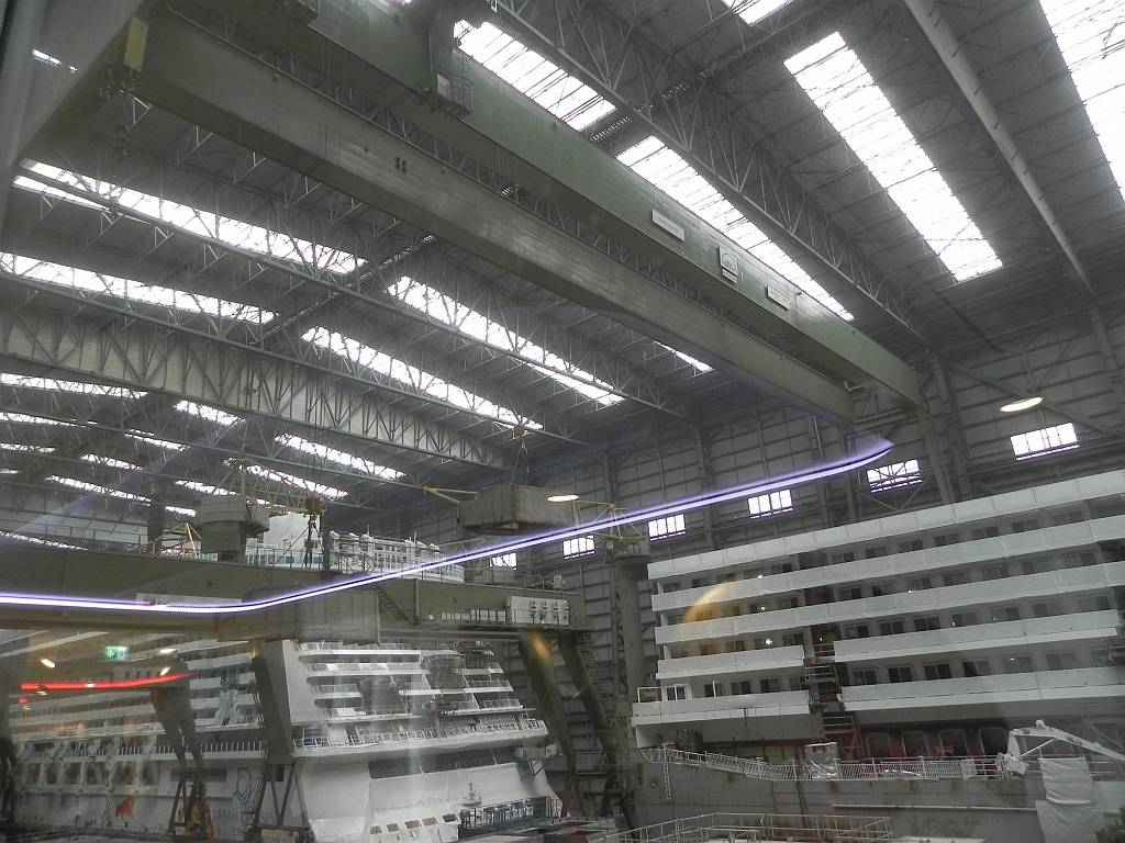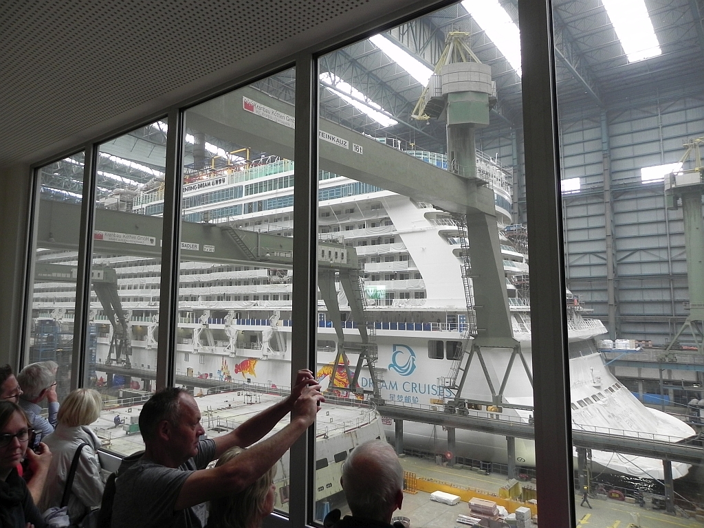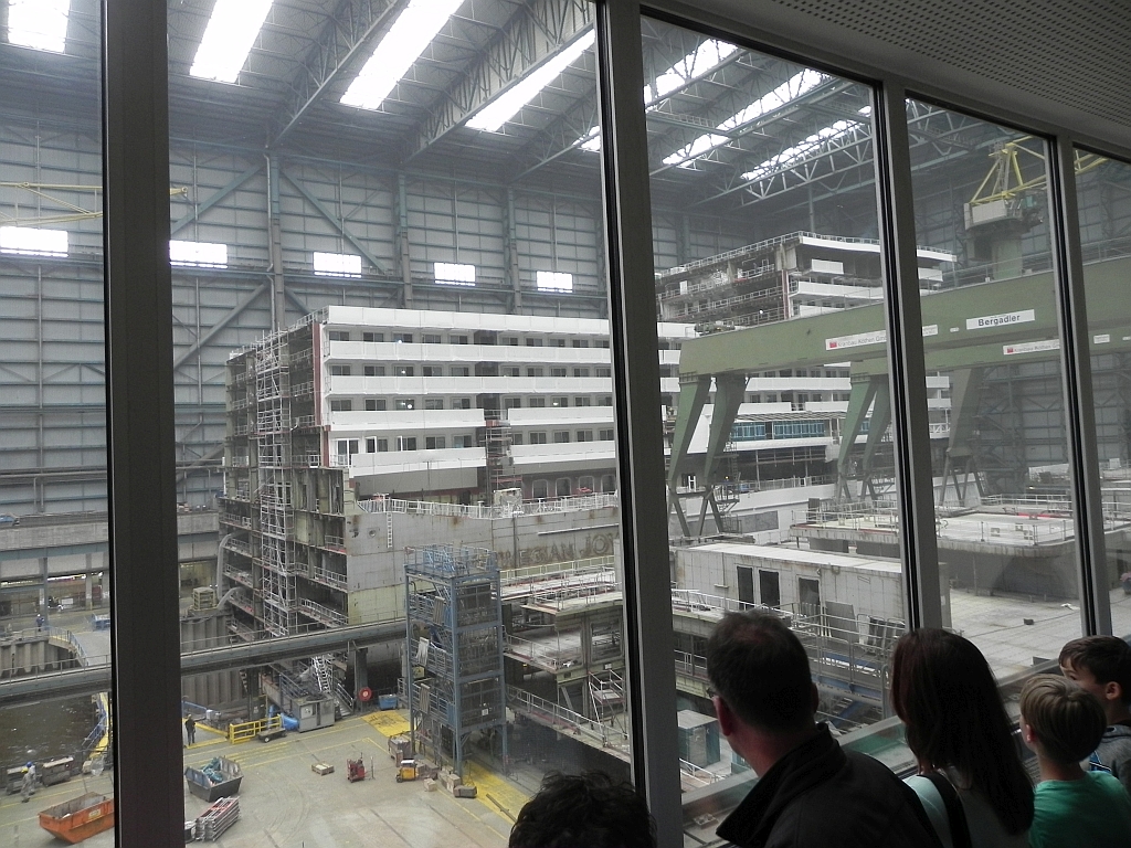 Vor dem Besucherzentrum erfuhren wir schon etwas von der recht redseligen und nicht besonders sympathischen Führerin über die Werft und die Umgebung. Der Schiffsbau findet im Grunde genommen in zwei Hallen (5 und 6) statt. In der größten Dock-Halle der Welt werden zwei Kreuzfahrtschiffe parallel gebaut. Bei dem einen werden einzelne Ebenen aufeinander gestapelt und so der Mittelteil der Schiffe gebaut. Bei dem zweiten werden jeweils zwei fertige Mittelteile (ein Schiff besteht aus vier Mittelteilen und einem Heck und einem Bug) zusammen mit Heck und Bug zu einem fertigen Schiff gebaut.