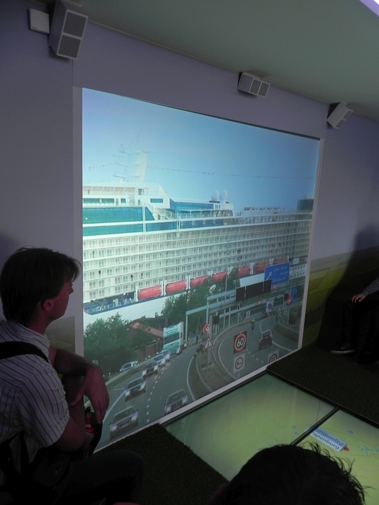 Im Anschluss wurde gezeigt, was passiert, wenn ein Schiff vom Stapel gelaufen ist und zur Übergabe fährt. Dann passiert nämlich das, was man dann oft im Fernsehen sieht: Ein riesiges Schiff macht sich die Ems entlang.