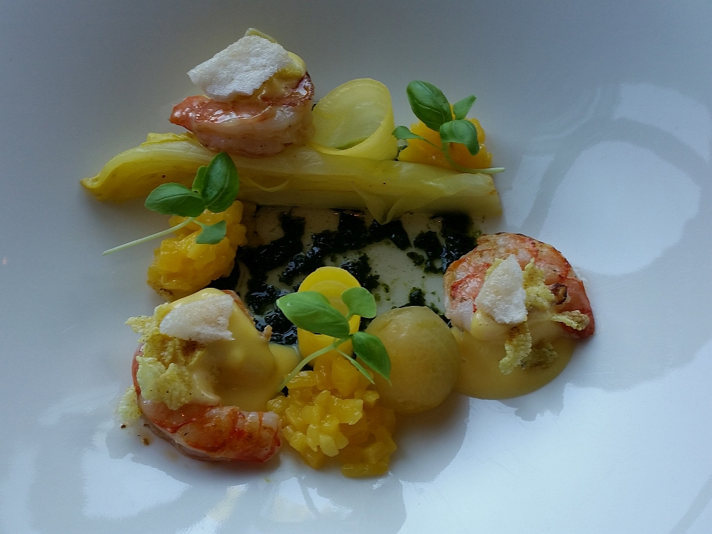 Geröstete Wildgarnele mit Basilikum, Kurkumabutter, Ingwer und marinierter Mango (war ok)