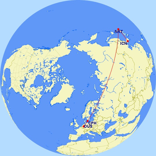 Und dann den Weg zurück: Von Seoul nach Tokio, eine Nacht am Flughafen und dann über Kopenhagen wieder zurück nach Düsseldorf.