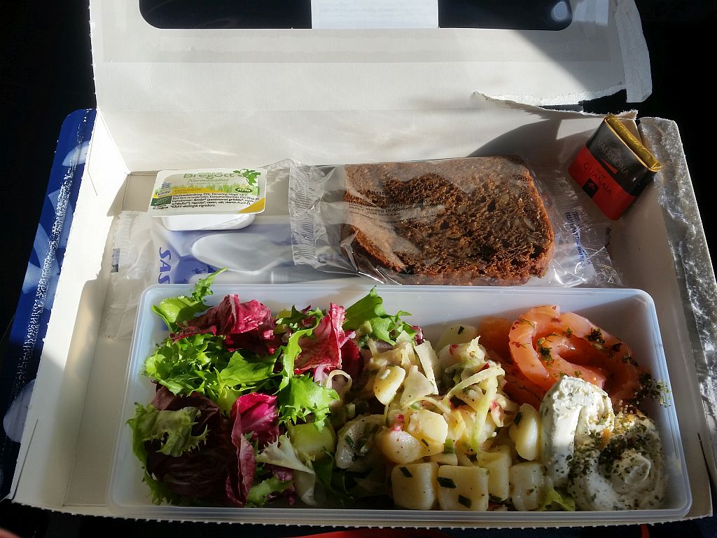 Zwischendurch noch ein kleines Essen (wie immer entpuppen sich unsere Flüge zu einer Fressorgie) mit leckerem Lachs und trockenen Salat.