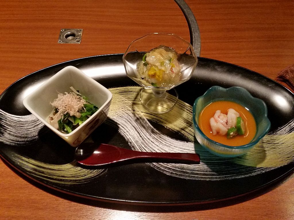 Vorspeise von Jens: Links ist Spinat mit Bonito-Flocken, rechts Garnelen oder Flusskrebse mit Tofu und in der Mitte ist Qualle mit Gemüse.