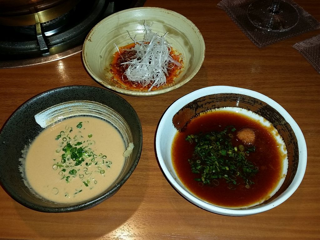 Dazu gab es dann noch drei Dips – einen mit Sesam, einen mit Ponzu und einen mit etwas scharfem Öl.