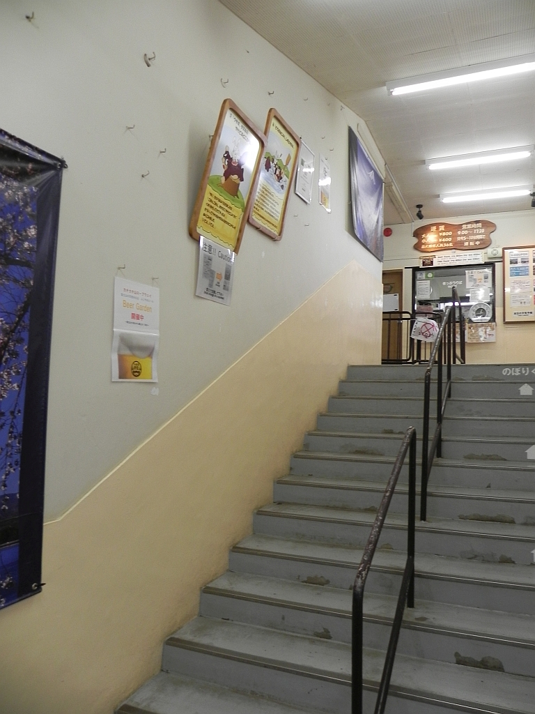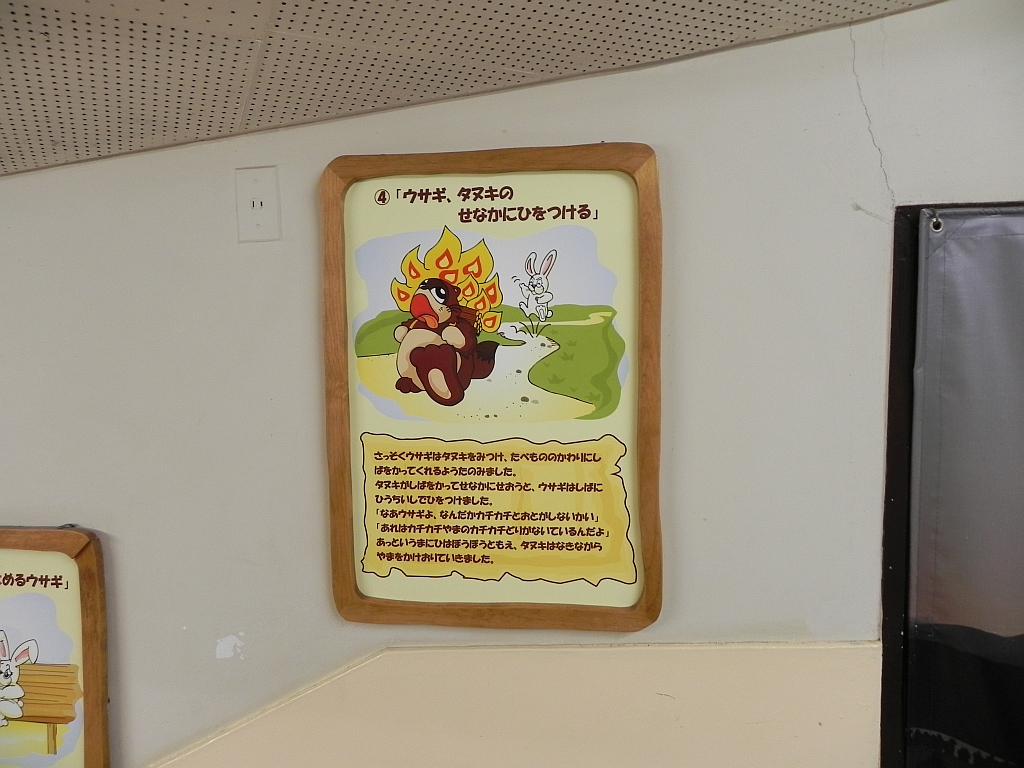Also rauf. Den Namen „Kachi-Kachi“ hat die Bahn übrigens aufgrund einer Geschichte namens „Kachi Kachi Yama“ in welcher ein diebischer Waschbär (Tanuki) von einem Hasen gefasst, angezündet und in einen Fluss geworden wird. Jetzt nicht so die klassische Kindergeschichte … obwohl man durch Cartoon-Figuren versucht das ganze nicht so plastisch darzustellen.