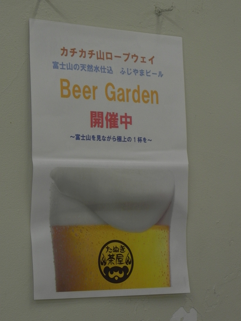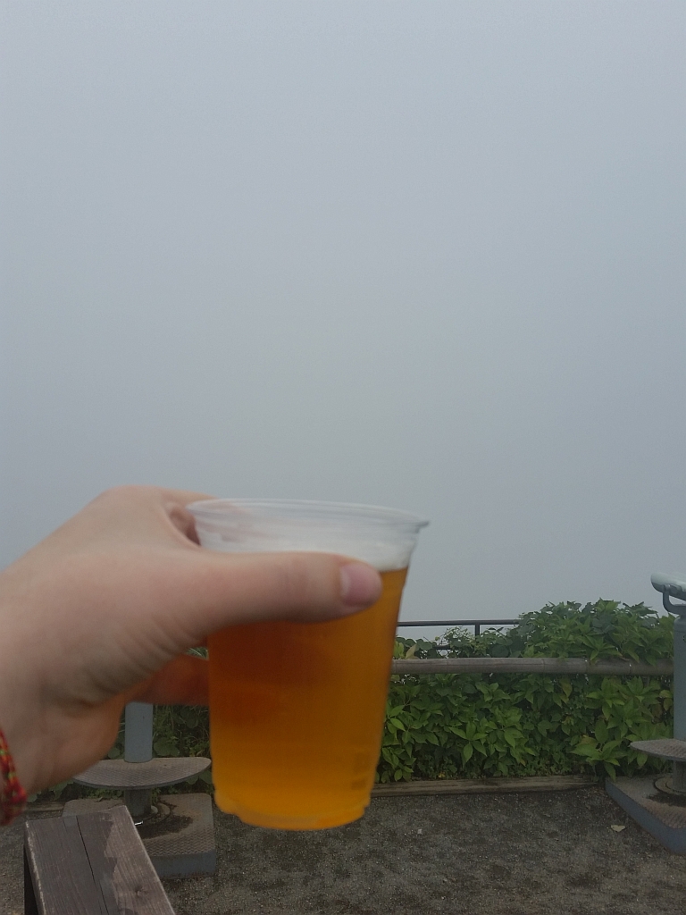 Das Bier (Fujiyama Lager) war sogar ganz trinkbar. Witzig war ein französisches Pärchen, die mit der nächsten Seilbahn (und gleichen zerstörten Hoffnungen auf einen Blick auf den Fuji) hochgefahren sind. Sie sah eine kitschige Glocke die man bimmeln lassen soll, wenn man den Fuji sieht (das bringt Glück), er sah uns mit dem Bier in der Hand und brummelte nur „ahhh … biere“ und ging zielstrebig zum Ausschank und kehrte wenige Sekunden später glücklich mit einem Bier in der Hand zurück. Haben uns dann zugeprostet (seine Frau/Freundin fand das nicht so gut).