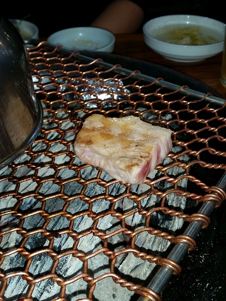 Korean BBQ oder auch Gogigui bedeutet: Man sucht sich das Fleisch aus, bekommt Salatblätter und Sesamblätter sowie Kimchi, Knoblauch, Zwiebel, Pilze, andere Salate und Saucen. Dann grillt man das Fleisch auf dem Grill in der Mitte des Tisches.