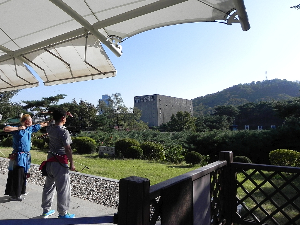 Was man hier sieht, ist die traditionelle koreanische Bogenschießkunst welche man hier trainieren oder ausprobieren kann. Die drei kleinen Ziele da hinten müssen übrigens getroffen werden und der Herr vor uns in dem grauen Gewand hat in etwa 2 von 3 Schüssen ins Ziel gebracht. Sehr beeindruckend.