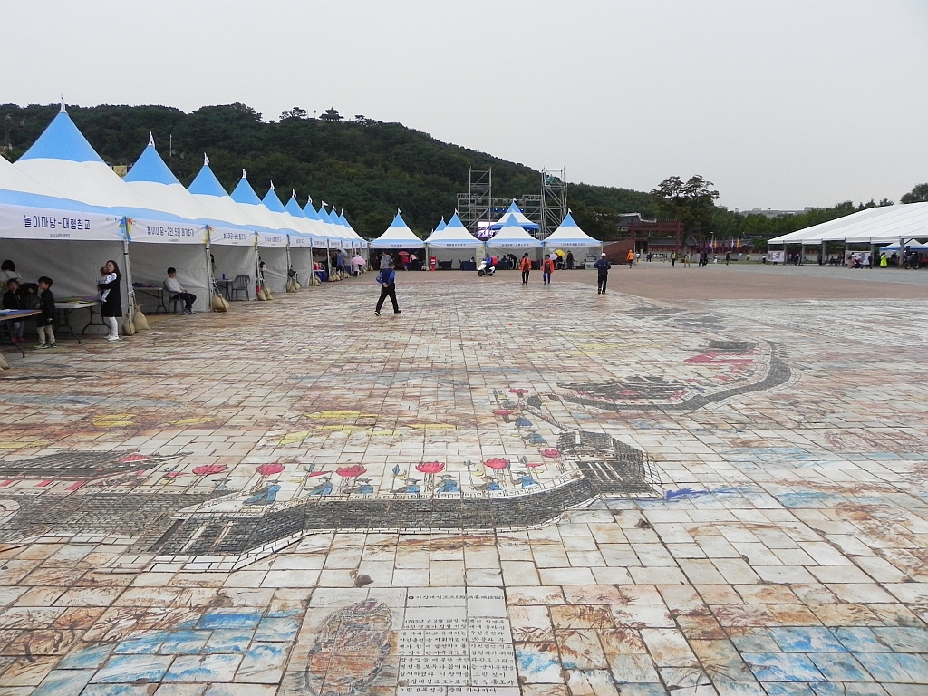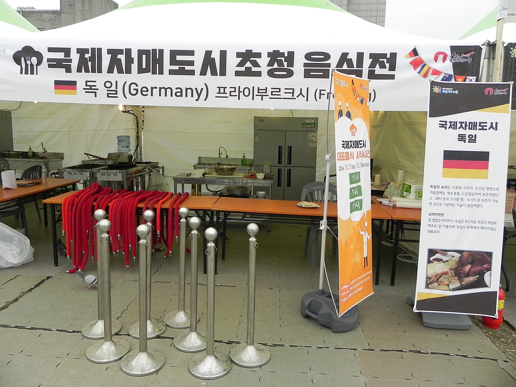 Zu einem Festival gehören in Südkorea auch immer Zelte. Diesmal entweder mit historischen Aktivitäten oder Spielen oder irgendwelchen Vereinen, die etwas ausstellen. Oder Freßbuden mit Essen aus den Partnerstädten von Suwon. Eine dieser ist übrigens das schöne Freiburg im Breisgau, dessen Köche durch Abwesenheit glänzten.