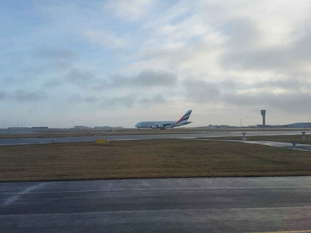 Wie in Düsseldorf hatte man auf dem Weg zur Startbahn einige schöne Blicke auf andere Flugzeuge, so auf einen A380 von Emirates oder einige SAS A340.