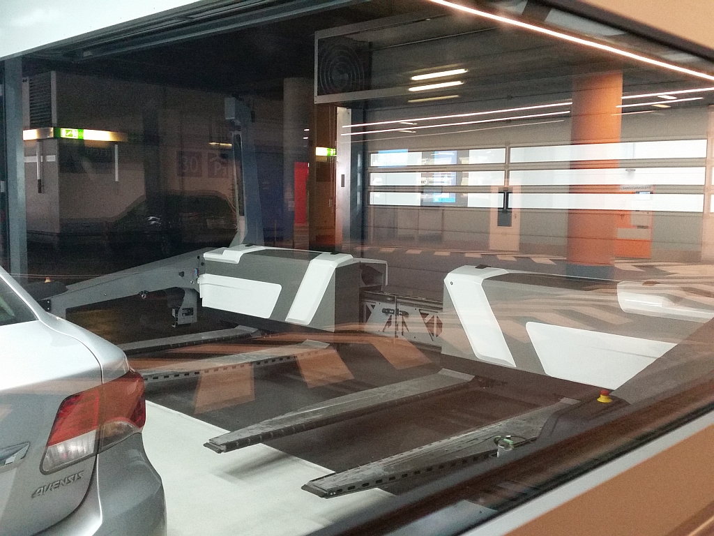 Also hin zu unserem Parkplatz-Roboter, der unser Auto mit einem neu montierten Vorderrad mitnahm.