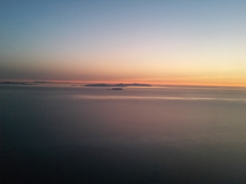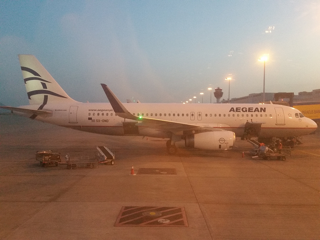 Der Rest des Fluges bestand aus Essen, Musik, Sudoku und Lesen. Und dann landeten wir über ein in der Dämmerung liegendes Athen auf dem etwas außerhalb liegenden Flughafen.