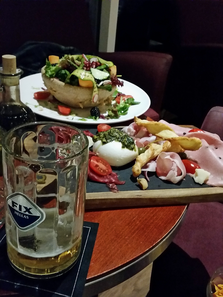 Fast schon schade, dass wir am nächsten Tag um 3:40 Uhr (!) aufstehen mussten, da unser Flug nach Santorini um 5:15 Uhr startet. Aber wir haben uns dann noch ein kleines Abendessen in der Hotelbar gegönnt – sehr lecker!