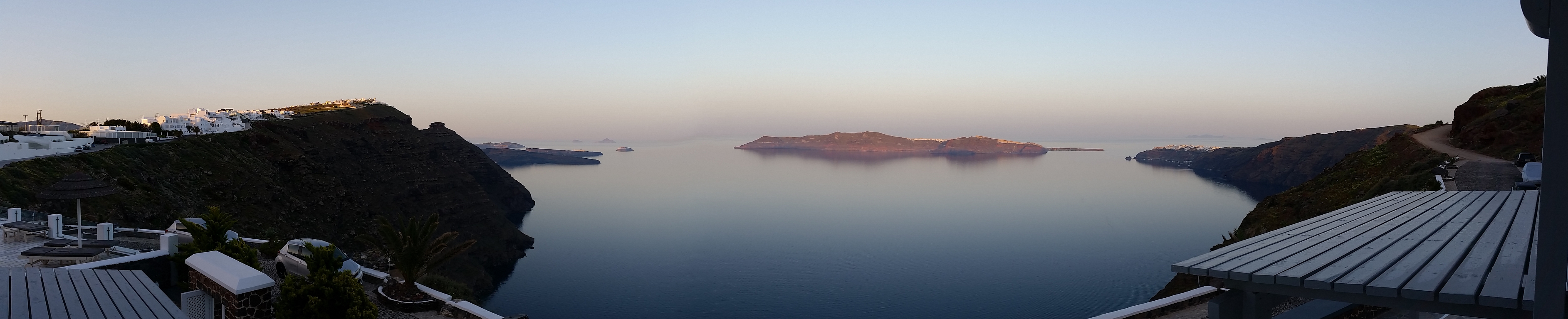 An der Unterkunft, dem Santorini Princess Spa, angekommen wurden wir erwartet und sehr nett empfangen. Die Rezeptionistin führte uns herum, zeigte uns netterweise alles und übergab uns dann unser Zimmer, welches als herausstechenste Merkmal diesen Blick vom Balkon hat: