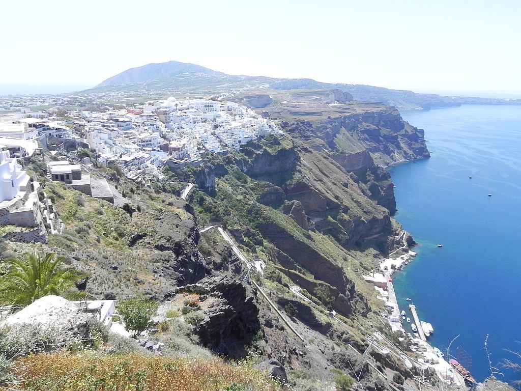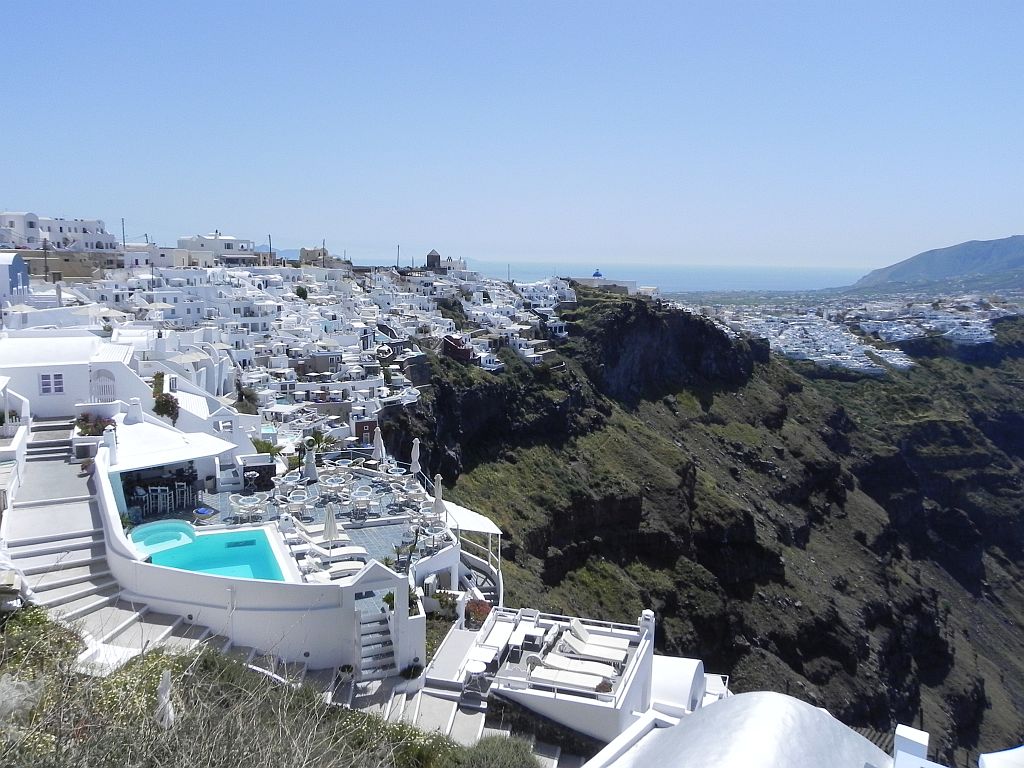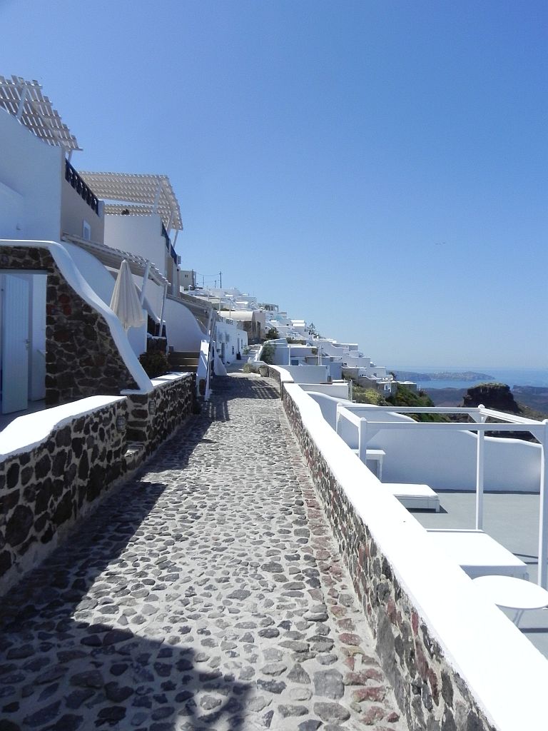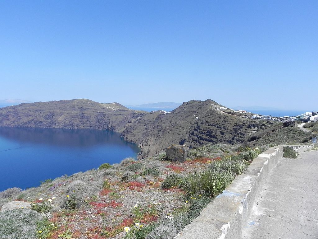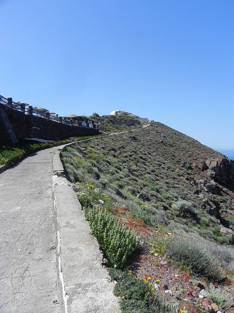 Als erstes haben wir uns vorgenommen, den etwa 4 Kilometer langen Weg von unserem Hotel nach Fira zu spazieren. Dieses Stück ist quasi ein Teil des Küsten-Wanderweges von Fira nach Oia („Ia“ ausgesprochen) wobei unser Hotel etwa auf 1/3 der Strecke von Fira aus gesehen liegt. Heute also das erste Drittel, demnächst die anderen zwei Drittel.