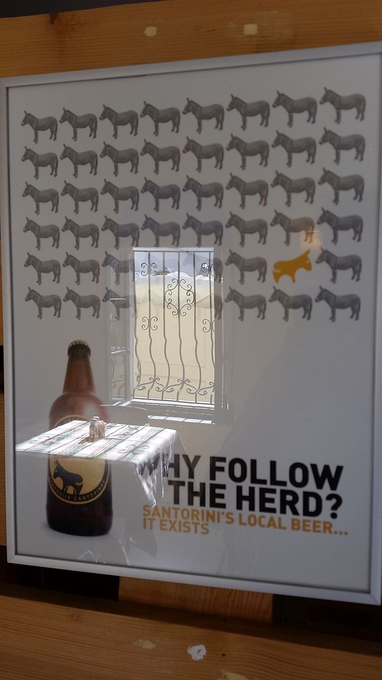 Nach einem kleinen Spaziergang wollten wir eigentlich noch was essen. Nachdem aber unsere ersten Versuche vor verschlossenen Türen endeten, haben wir uns nach Fira aufgemacht. Dort hatten wir von der Brauerei die Adresse des einzigen Ladens bekommen, wo es den „White Donkey“ geben soll. Also haben wir uns eine Bushaltestelle (diesmal eine weiße Bank neben einem Busschild – wir waren uns nicht sicher, ob wir so richtig waren) gesucht und sind wieder nach Fira gefahren. Witzigerweise war der Kassierer bei uns der gleiche wie bei der Hinfahrt und er hat uns wirklich auch wiedererkannt und gefragt, ob das Bier geschmeckt hat.