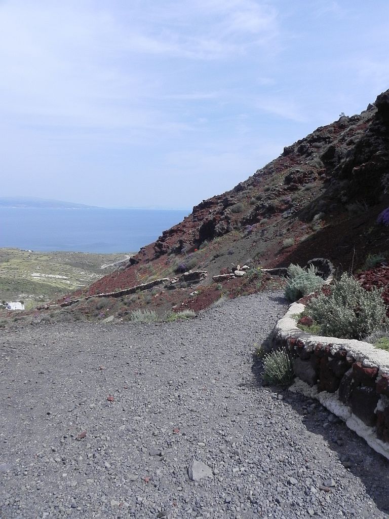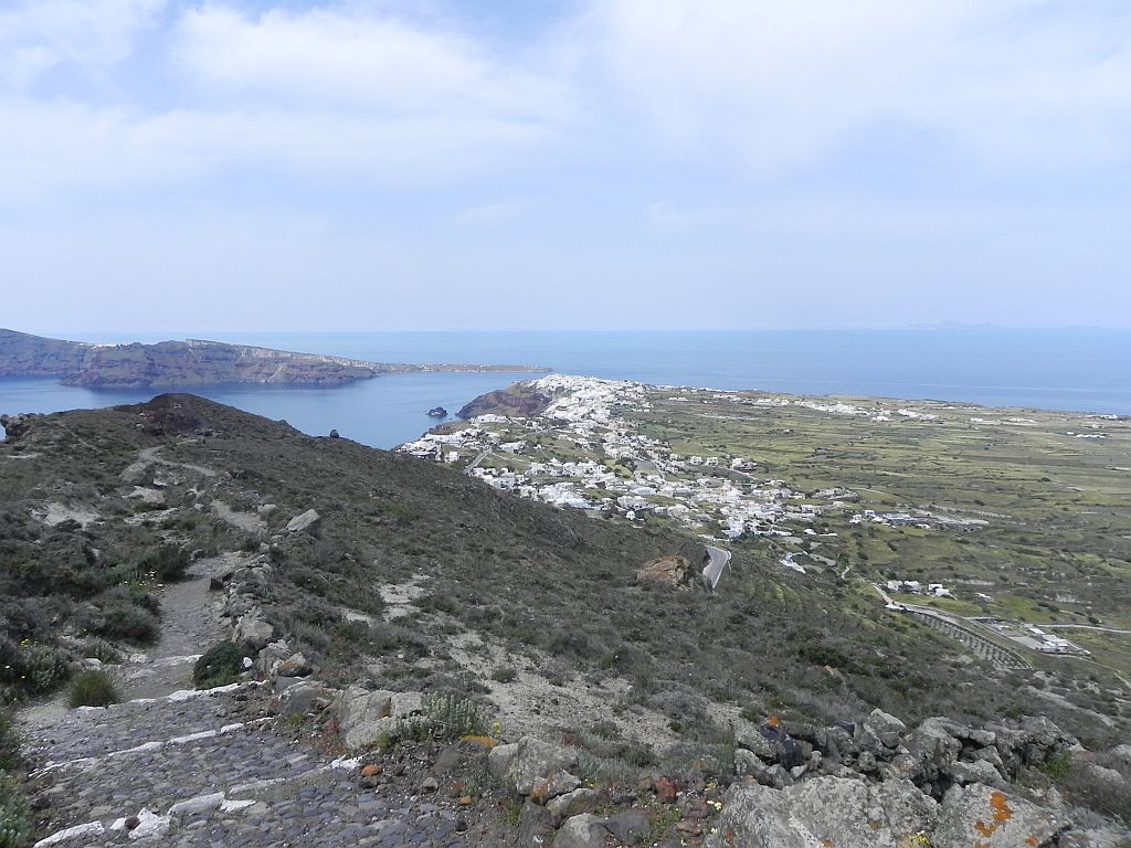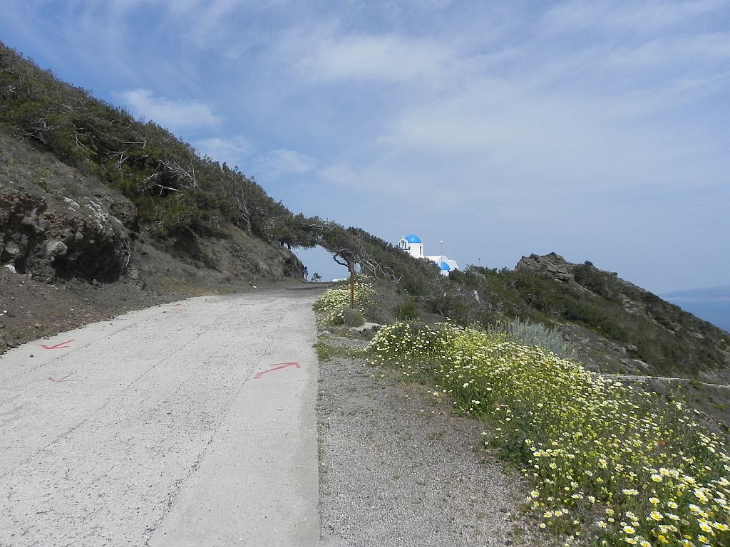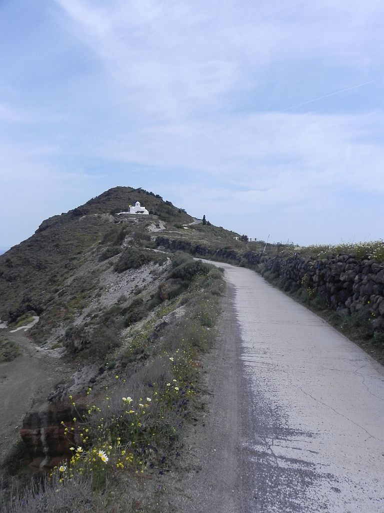 Das erste Stück (etwa ein Kilometer) ging der Weg berauf zu einer kleinen Kirche. Dieses Stück war auch einer der wenigen Abschnitte, der nicht direkt an der Kaldera-Wand entlang führte – dafür hat man einen schönen Blick auf den flachen Teil von Santorini.