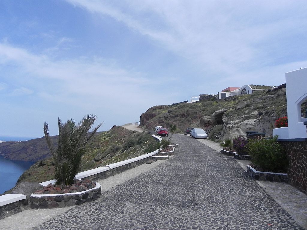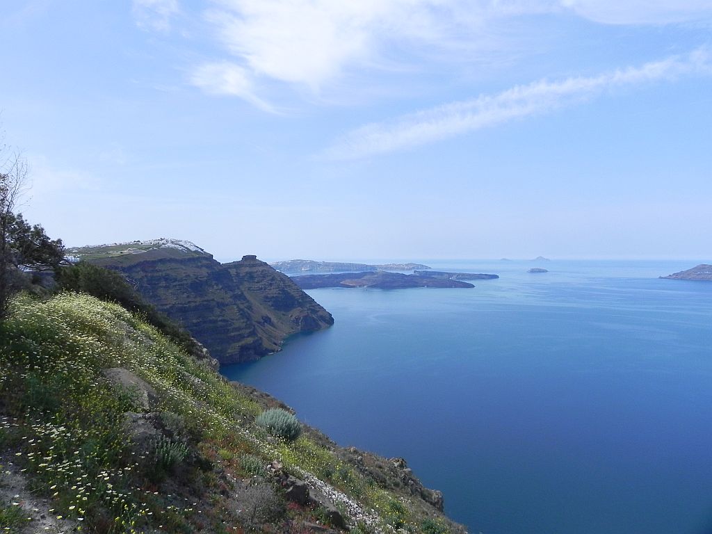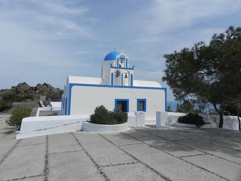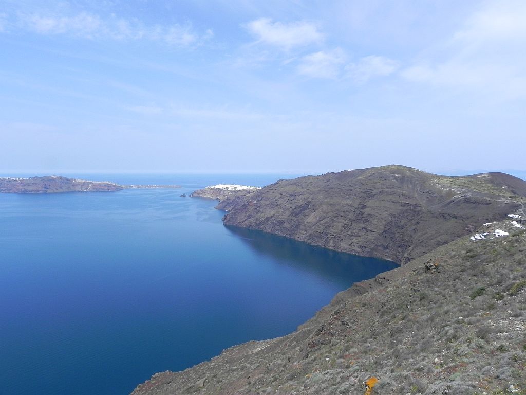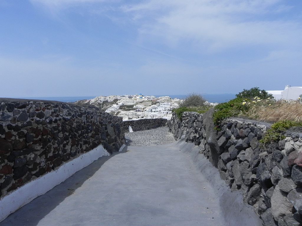 Das erste Stück (etwa ein Kilometer) ging der Weg berauf zu einer kleinen Kirche. Dieses Stück war auch einer der wenigen Abschnitte, der nicht direkt an der Kaldera-Wand entlang führte – dafür hat man einen schönen Blick auf den flachen Teil von Santorini.