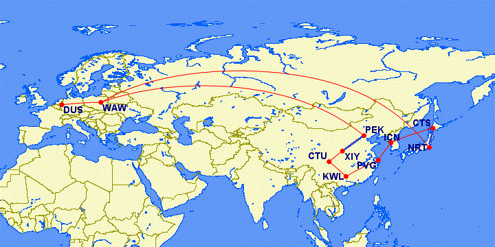 Geflogen wird mit LOT über Warschau – wieder BusinessClass, allerdings sehr vergünstigt. In China selber fliegen wir mit Air China, China Southern und China Eastern beziehungsweise fahren mit dem Zug. Von Shanghai nach Sapporo geht es via Seoul mit Asiana. Und in Japan dann natürlich wieder Zug.