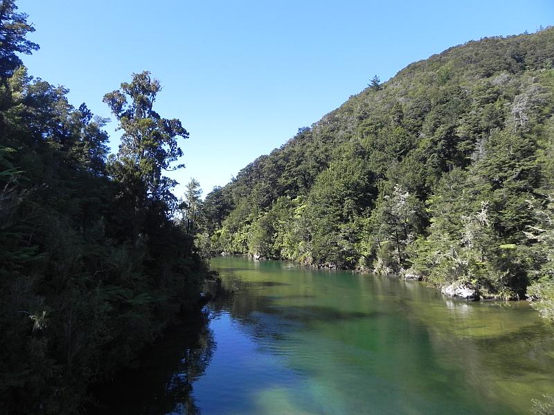 Danach wurden wir mit einem Boot abgeholt, ein Stück weiter nach Norden gefahren und an der Bark Bay abgesetzt. Von hier aus sind wir dann, immer entlang des Abel Tasman Coastal Track, nach Torrent Bay gewandert – etwa 6,4 Kilometer. Und auf diesem Weg liegt eben auch die schon angekündigte Hängebrücke mit einem schönen Ausblick über den River Falls.
