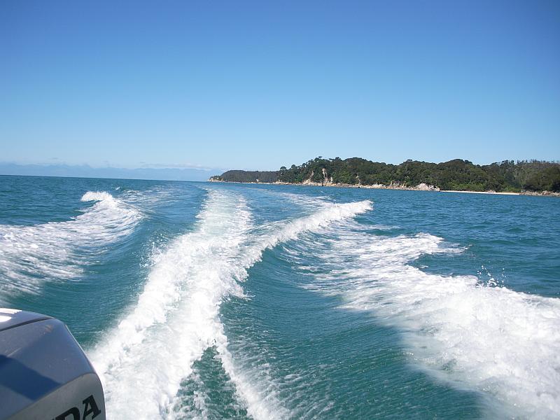 Nach einer Weile wurden wir wieder von Matt mit dem Boot abgeholt und zur Basis nach Marahau gebracht. Interessanterweise lief das so ab, dass wir am Pier mit dem Boot auf einen im Wasser stehenden Anhänger gefahren sind und ein Traktor dann diesen Anhänger mit dem Boot (und uns) über die Strasse zur Basis von Kahu Kayaks gefahren ist. Schwimmwesten waren für den letzten Teil auf jeden Fall nicht nötig.