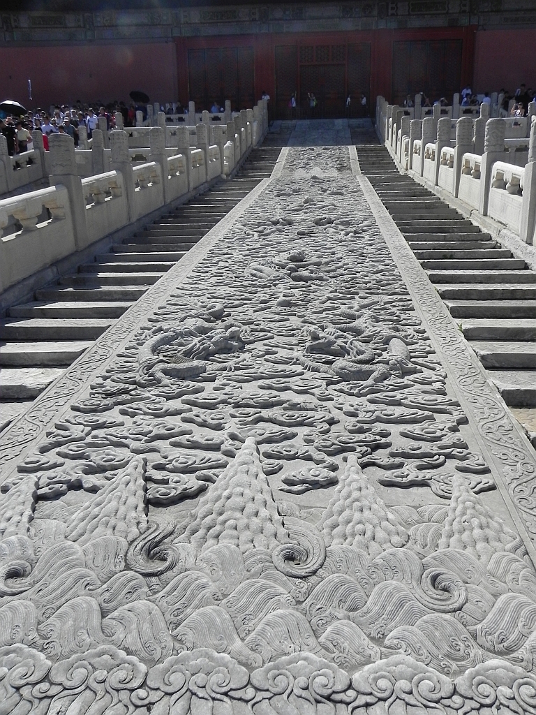 In der Mitte, genau in Nord-Süd-Richtung sieht man den Weg, den die Sänfte des Kaisers (und nur die) genommen hat. Die Kaiserin durfte einmal, beim Einzug in die Stadt, diesen Weg benutzen und die drei höchsten Beamten ebenfalls einmal. Ansonsten: Nur für den Kaiser.