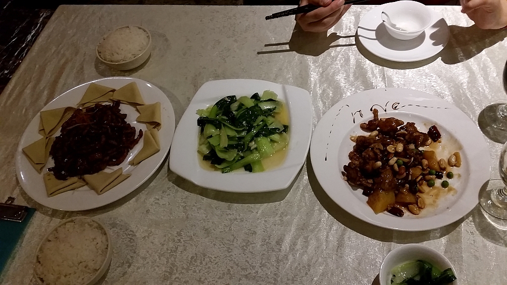 Von Rechts nach Links: Hühnchen mit Chili und Ananas, PakChoi mit Knoblauch und Schweinefleisch mit Tofu (ein beliebtes Gericht in diesem Restaurant). Dazu wurden uns noch zwei Portionen Reis aufgezwungen …
