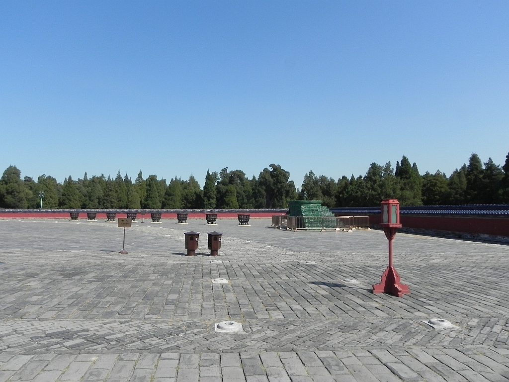 Der Himmelstempel liegt im Süden der Stadt, wohin wir vom Mittagessen schon mehr oder weniger hingefahren sind. Die Anlage ist ein großer Park und von einer großen Mauer umgeben. Auch diese Anlage ist streng nach Feng Shui an einer Nord-Süd-Achse ausgerichtet und voller Symbolik. Generell unterscheidet man einen südlichen und einen nördlichen Teil, die von einer Strasse verbunden sind.
