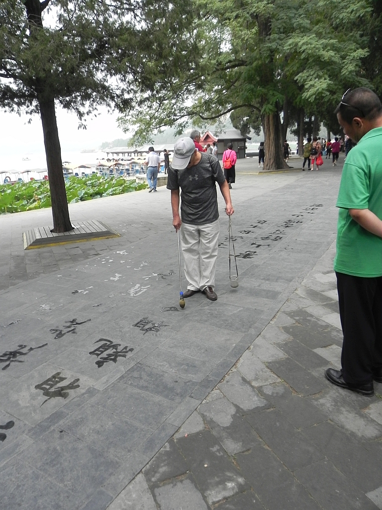 Ansonsten sieht man im Park viele Menschen, die für uns komisch aussehende Dinge tun. Beeindruckend war dieser Mann, der ein Spruch mit Wasser auf die Steine geschrieben hat.