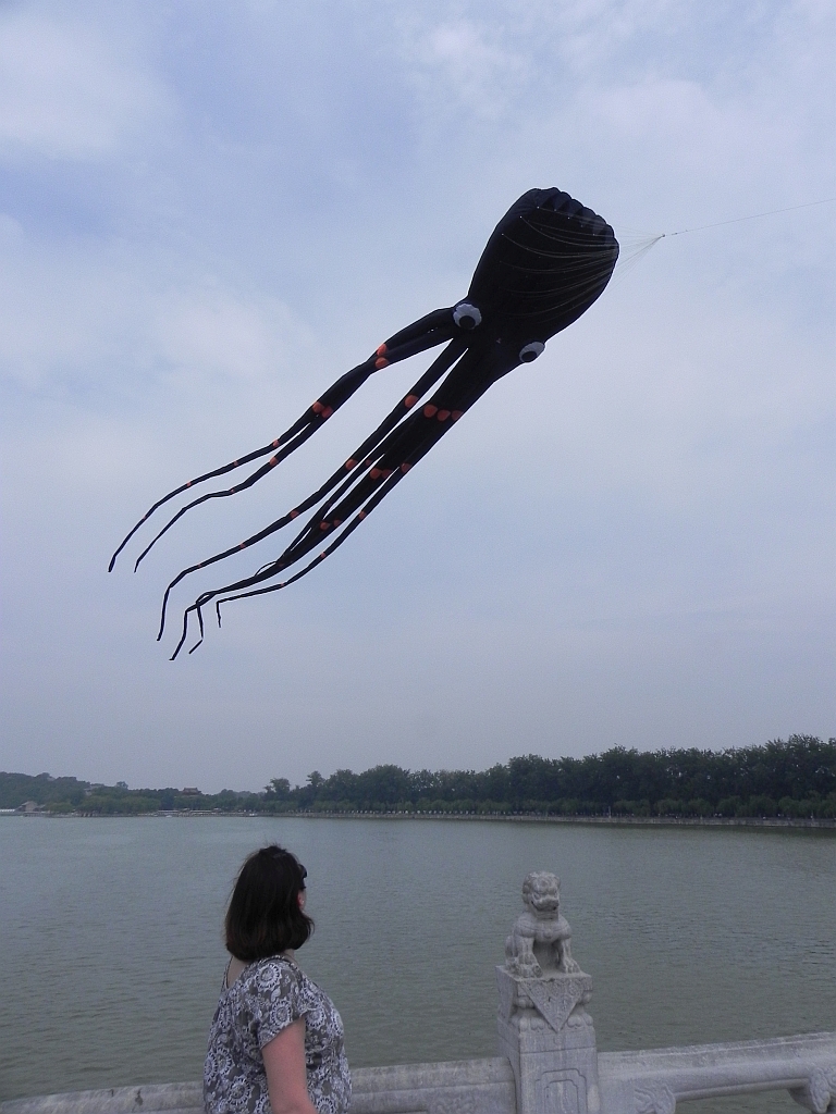 Die Brücke, deren höchster Punkt genau auf dem 9. Bogen von links oder rechts liegt (Symbolik überall), war dann der letzte Punkt auf unserer Tour. Auf der Brücke waren natürlich wieder viele Menschen, aber auch ein Drachenflieger mit einem Oktopus als Drachen. Auf dem Foto oben sieht man den Oktopus gerade aus dem Wasser gezogen.