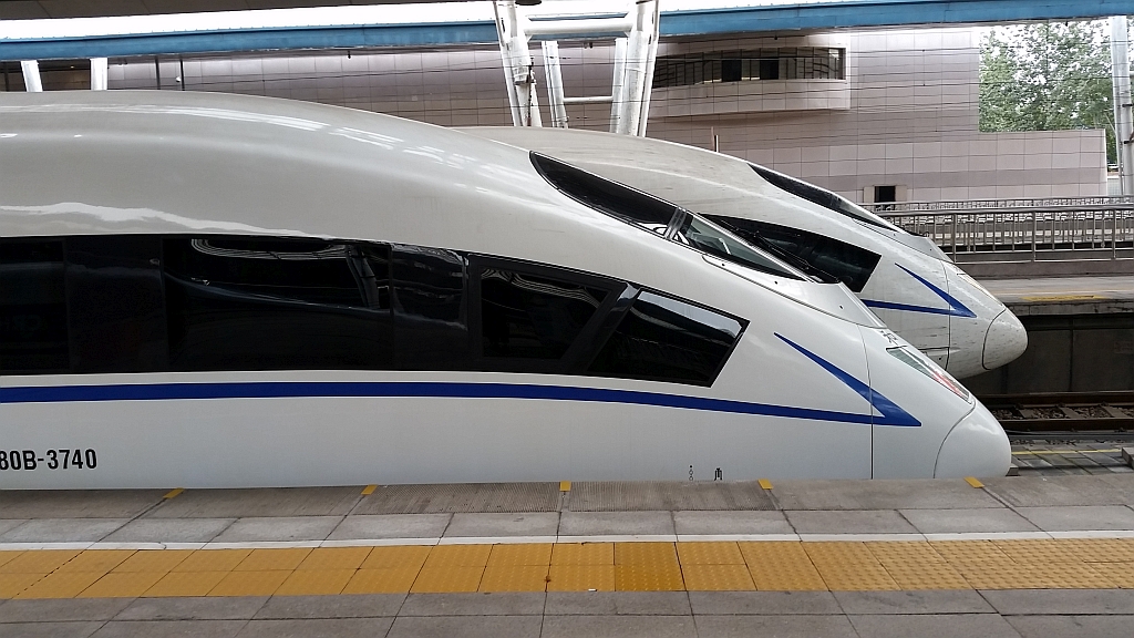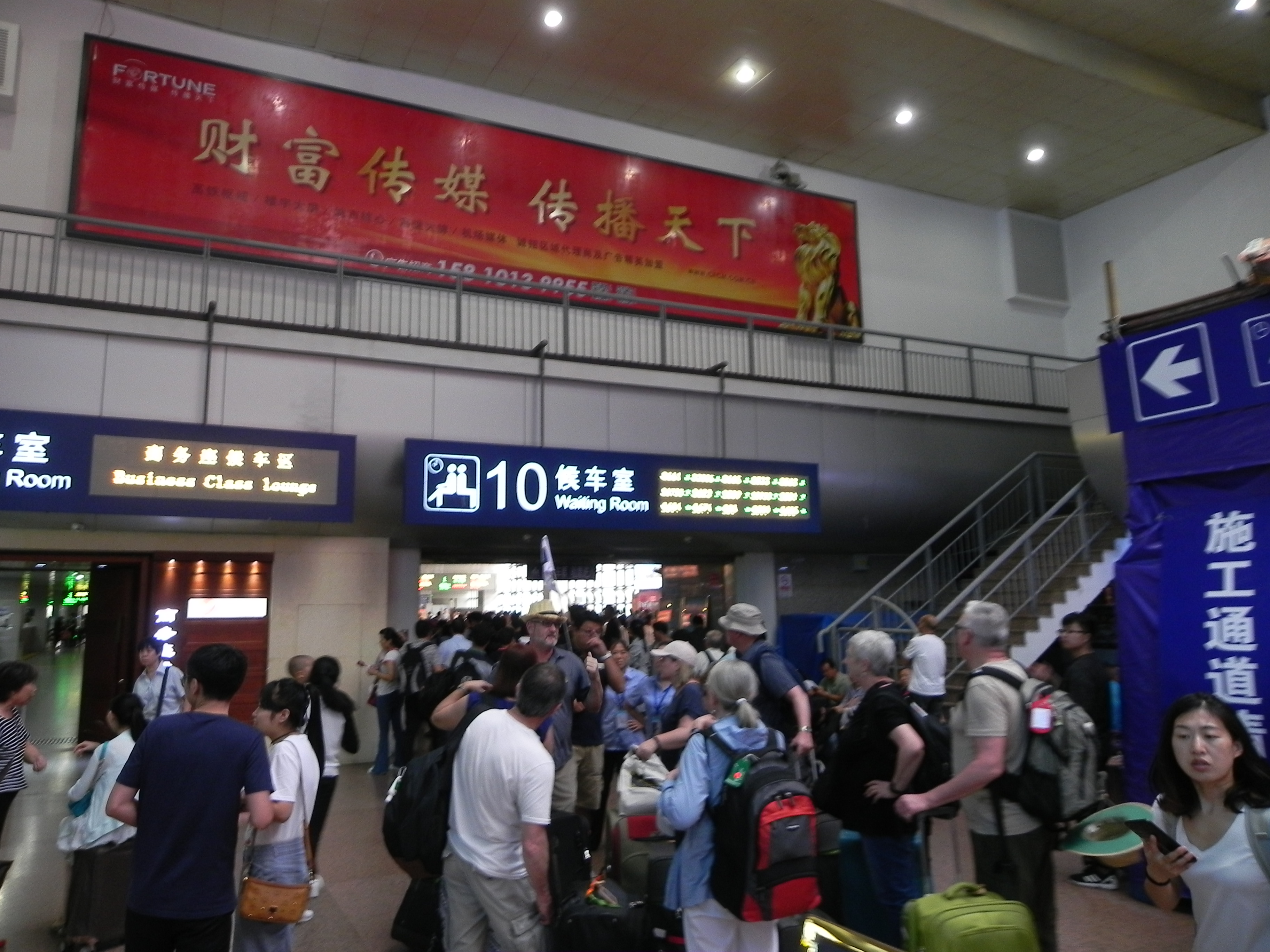 Bahnfahren in China ist wie in Deutschand auch. OK, bis auf die Flughafen-artige Kontrolle beim Eingang in den Bahnhof. Und die Art des Wartens, denn hier werden die Leute für einen bestimmten Zug in einen Warteraum „gesperrt“, wo dann alle darauf warten, dass der Zug an einem Bahnsteig ankommt und man einsteigen kann.