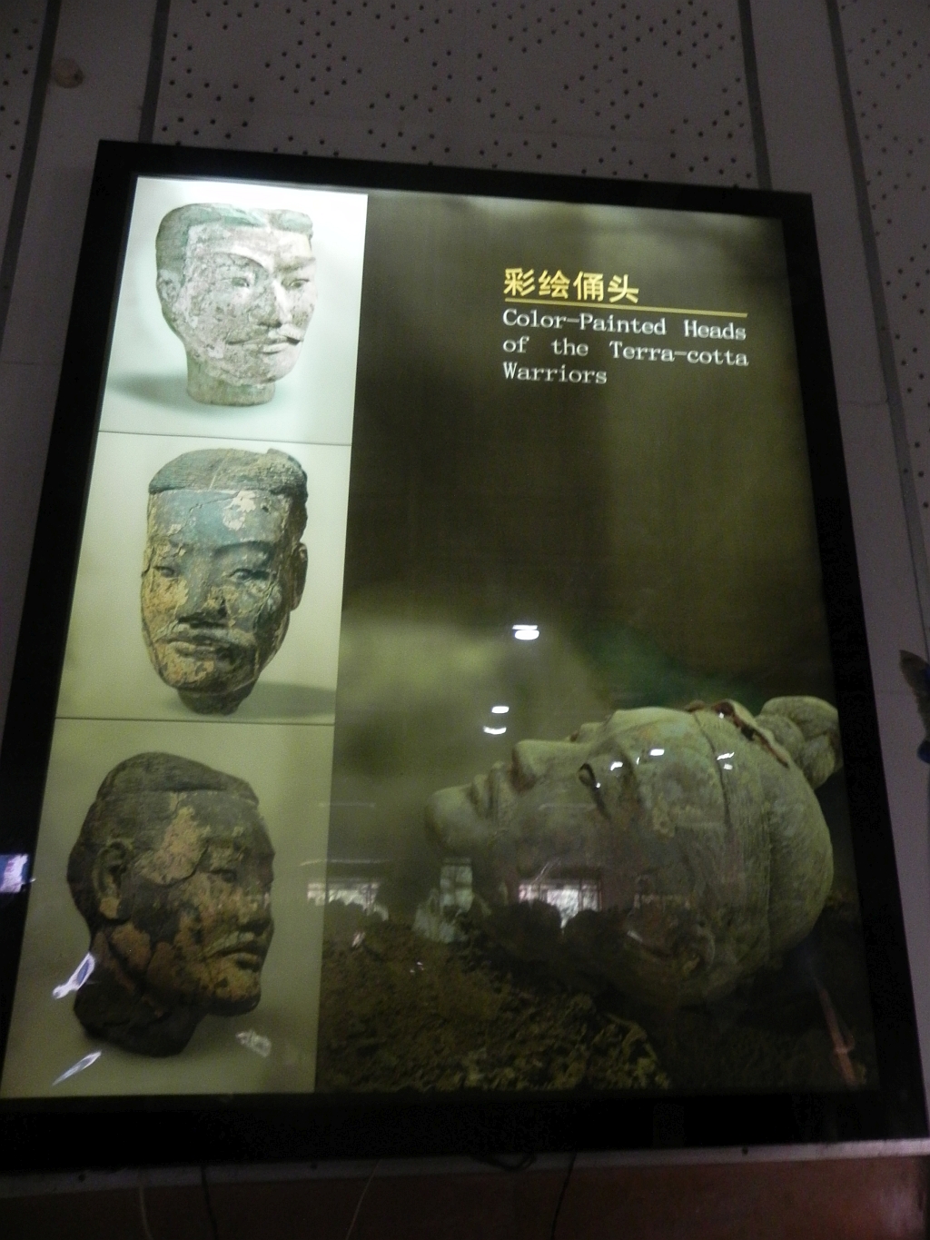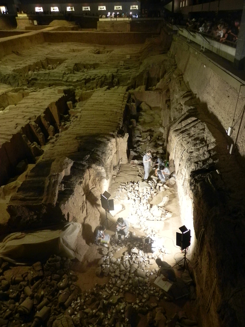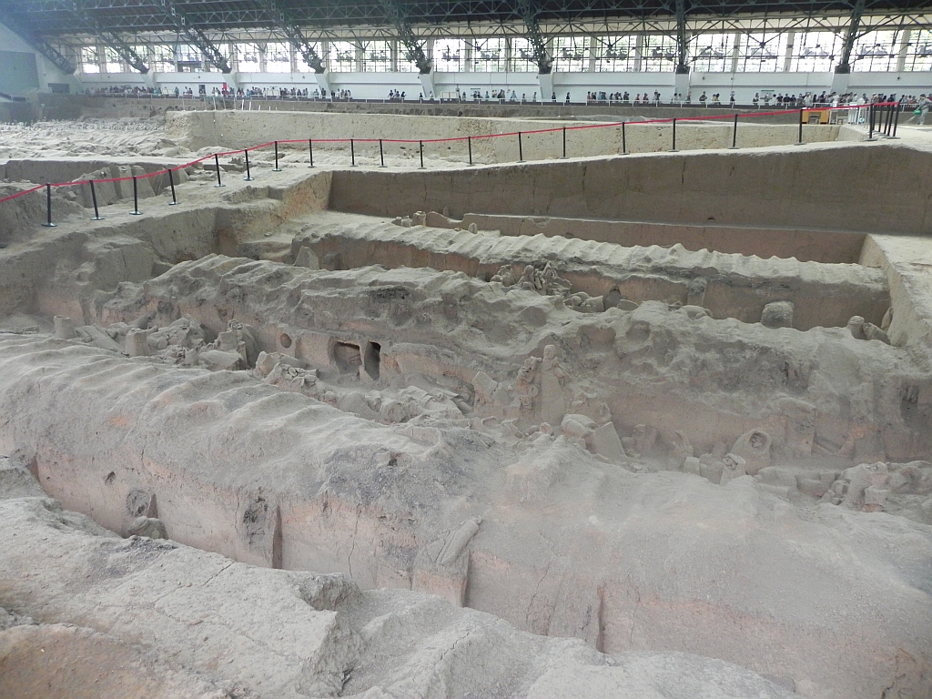 In der ersten Grube befinden sich etwa 6.000 Soldaten und 40 Kriegswagen mit Pferden aus Bronze oder Ton und hat eine Größe von 14.000 m². Die zweite Grube ist etwa 6.000 m² groß und enthält 1.200 Figuren. Die dritte Grube ist, wie schon gesagt, leer. In der 4. Grube befindet sich der Kommandostand mit 78 Figuren.
