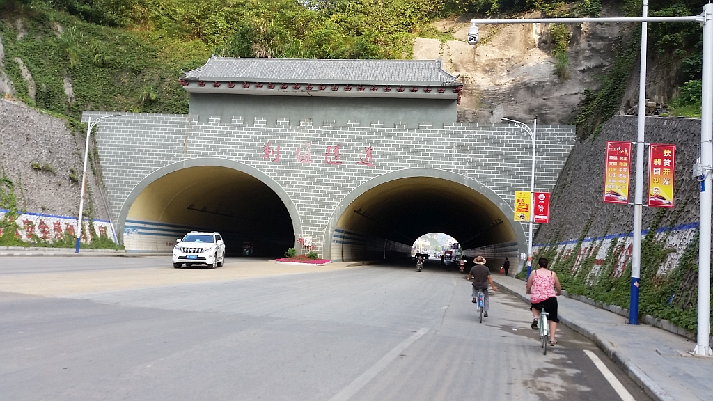 … ging es entlang einer Strasse zurück nah Yangshuo. Nicht besonders pitoresk, aber immerhin kamen wir voran. Und kamen sogar in den Genuss: Fahrradfahren in einem Tunnel, der von vielen anderen Verkehrsteilnehmern benutzt wird.