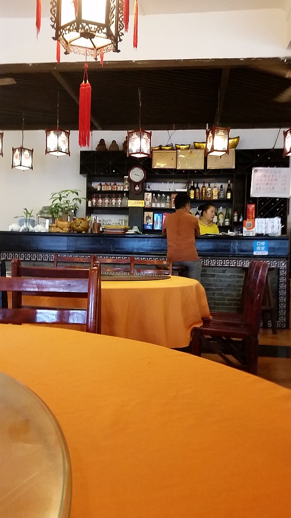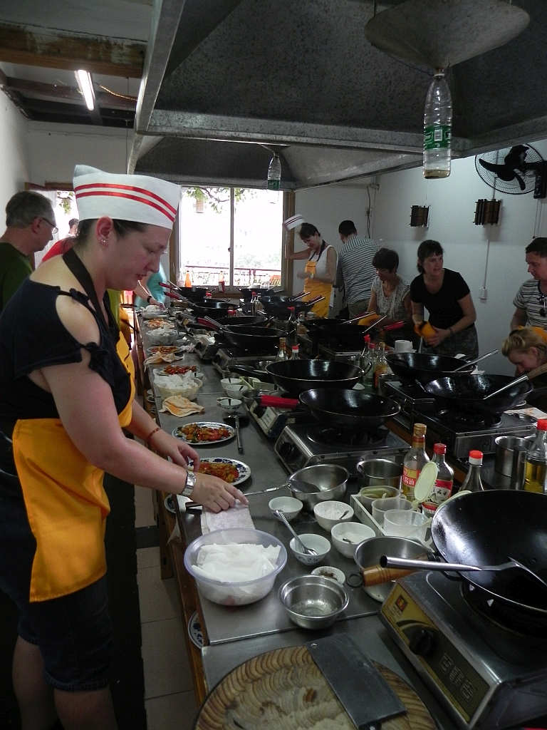Daher gingen wir mit Zhao unserem Guide in das Restaurant, wo der Kochkurs durchgeführt werden würde. Dort trafen wir auf unsere „Lehrerin“ (die Frau des Küchenchefs), die uns auch gleich informierte, dass „nur“ noch eine weitere Gruppe von 14 Leuten an diesem Kochkurs teilnehmen würde.