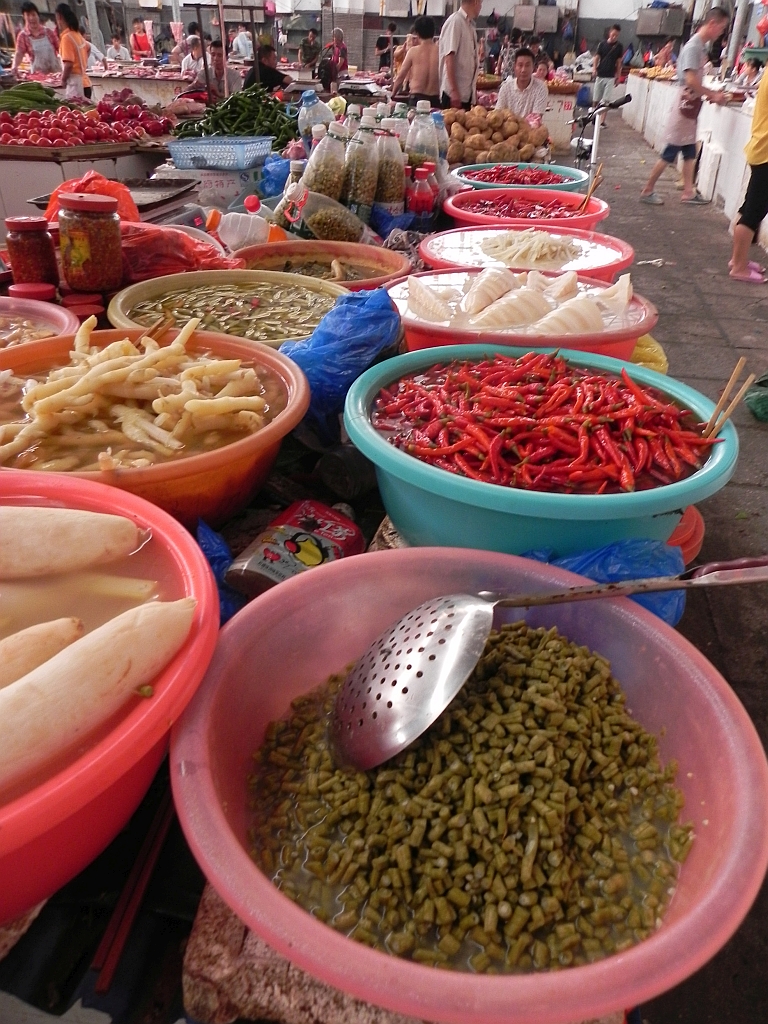 Die Bewohner hier lieben übrigens eingelegtes Gemüse. Auch dieses gab es hier auf dem Markt und vor dem Markt – sah lecker aus. Und wir kannten es vom Frühstück.