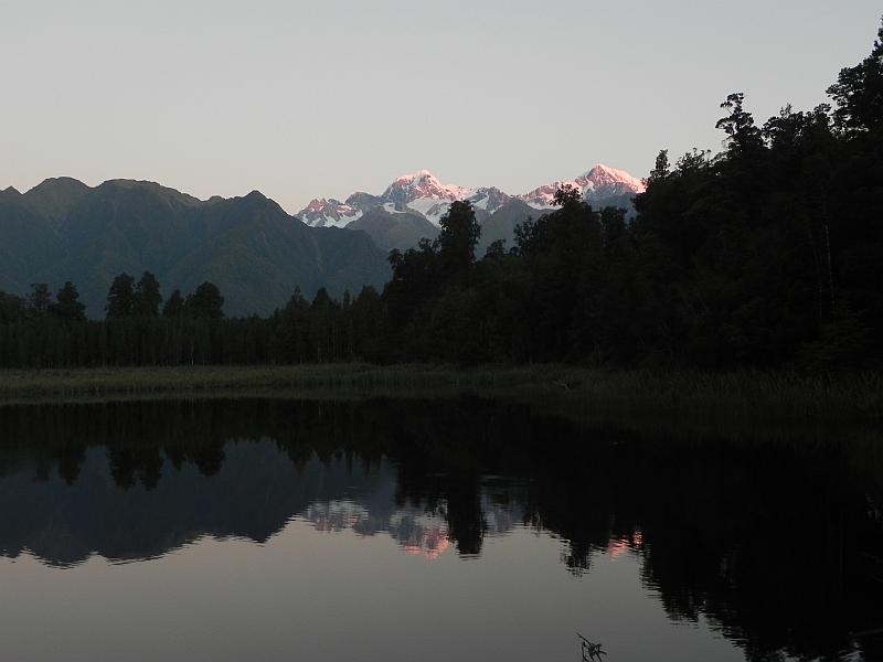 In Fox Glacier angekommen haben wir in unserem Motel eingecheckt. Auf dem Programm stehen heute noch: Essen und Lake Matheson. Am Lake Matheson wollten wir das super Wetter ausnutzen und eines der Klischee-Fotos von Neuseeland aufnehmen: Die im See gespiegelten Mount Cook und Mount Tasman!