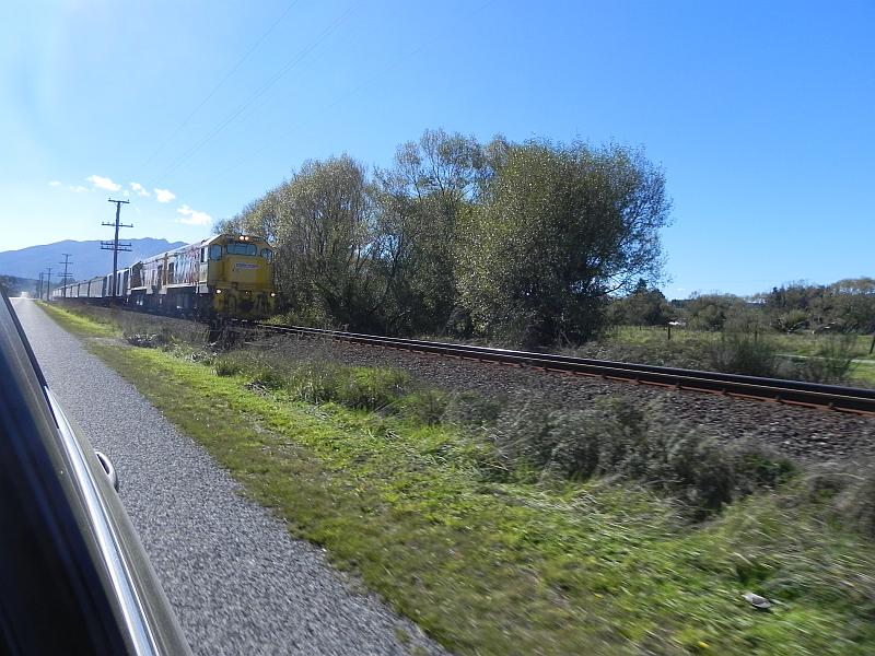 Zwischen dem Wechsel von dem SH7 auf den SH6 hatte ich noch die Idee, den Tranz Alpine in Greymouth abzulichten. Da wir aber durch die bereits erwähnten Stopps aufgrund der beeindruckenden Landschaft einiges an Zeit verloren haben, wollten wir an der Strecke auf den Zug nach Christchurch warten. Nach einiger Wartezeit (genutzt für eine Mittagspause) hatten wir die Nase voll und sind weiter in Richtung Fox Glacier gefahren. Natürlich kam dann der Zug um die Ecke, was Meike (die zu der Zeit gefahren ist) zu einem lustigen „Wir_fahren_ungefähr_so_schnell_wie_der_Zug“-Spiel genötigt hat.