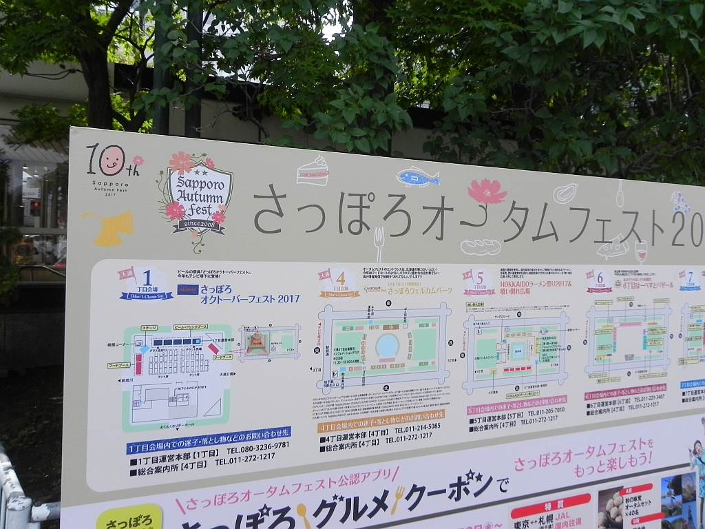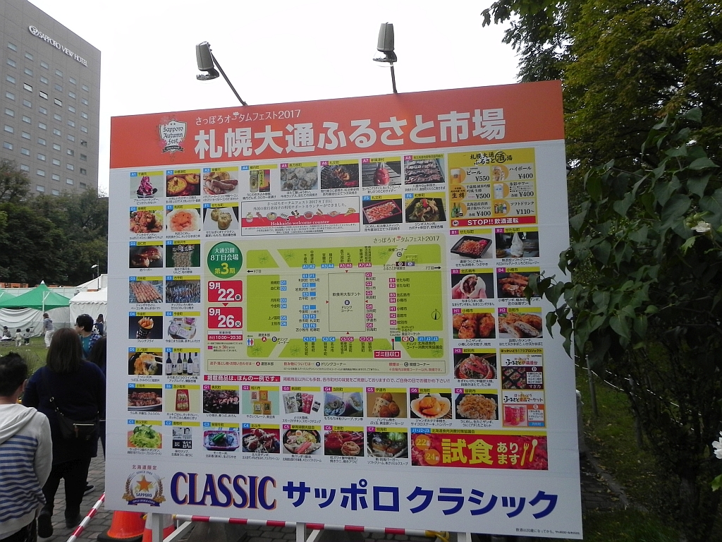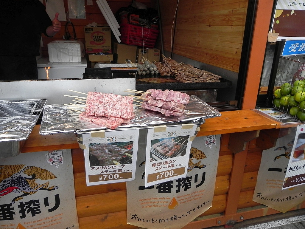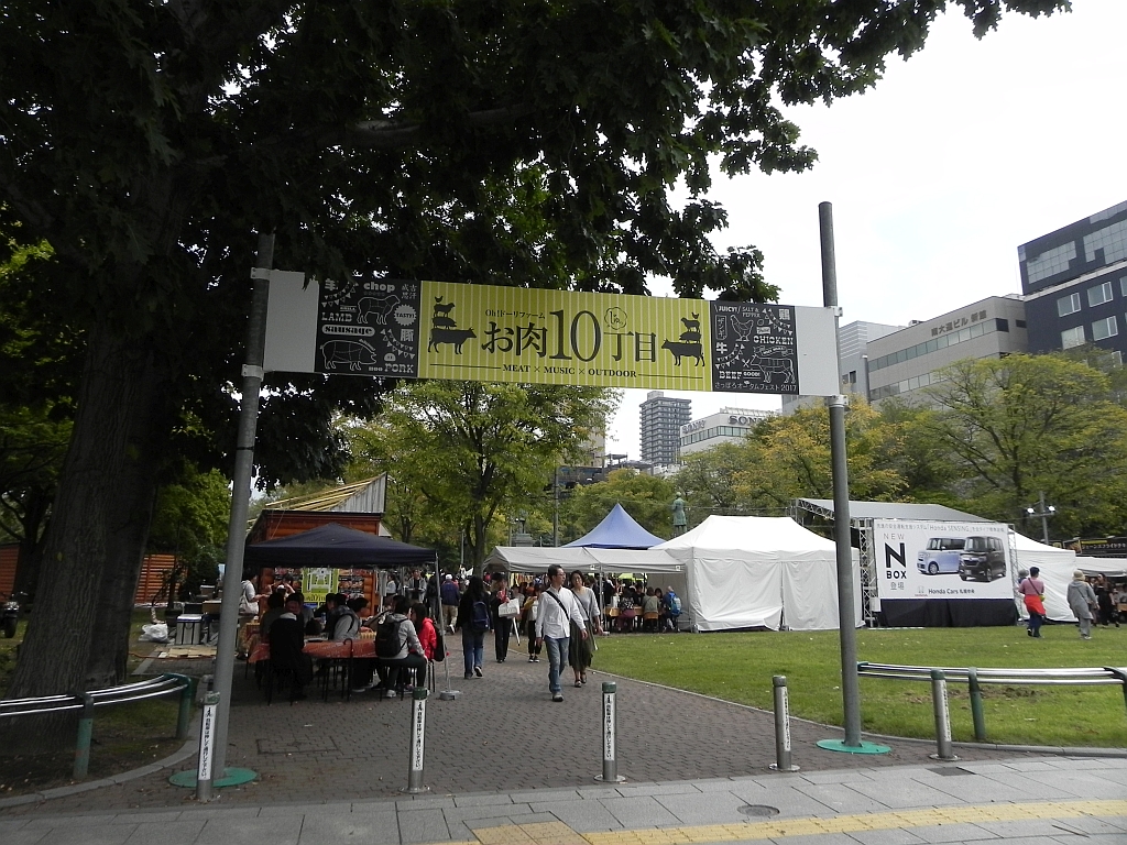 Rein in die Bahn und zum Odori Park, denn dort hatten wir gestern abend schon Zelte aufgebaut gesehen. Das Fest war das 10. Sapporo Herbstfest. Und was zuerst wie ein kleines, gemütliches Fest ausgesehen hatte entpuppte sich als 3 Wochen langes, mit über 200 Verkaufsständen bestücktes Riesen-Fest!