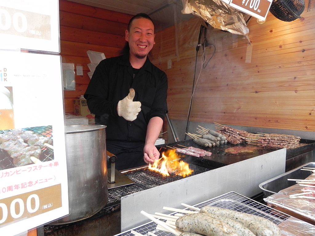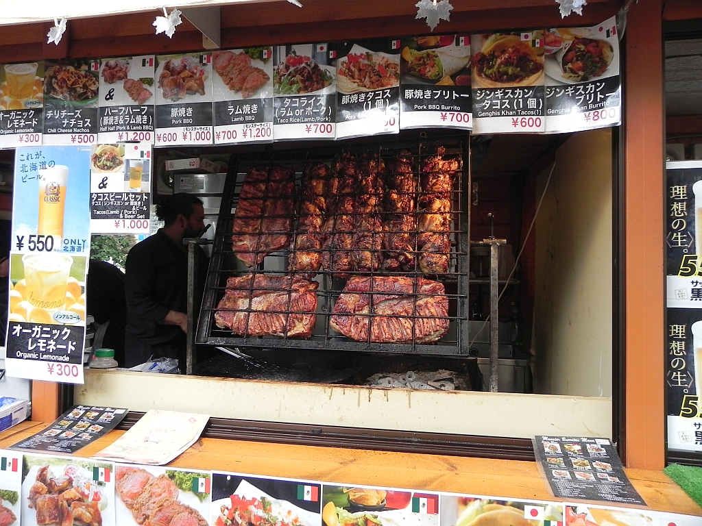 Natürlich stand dort ein bayrischer Festbaum. Auch wenn die zu erstehenden Nahrungsmittel aus Brasilien, Amerika oder Spanien kamen … zubereitet von echt netten Japanern.