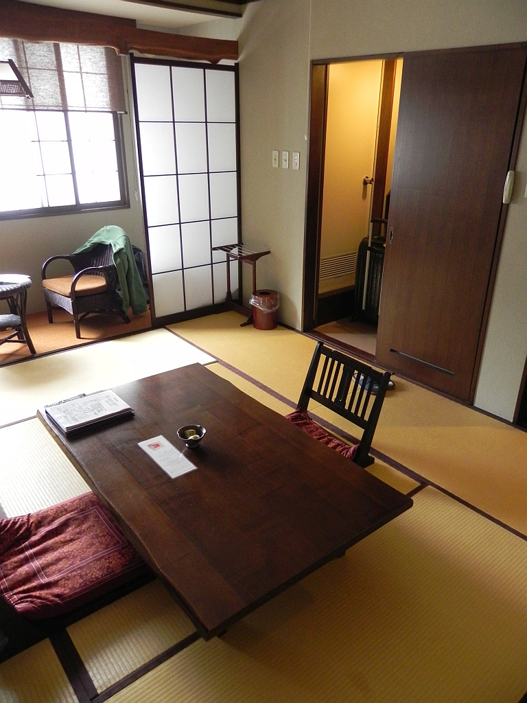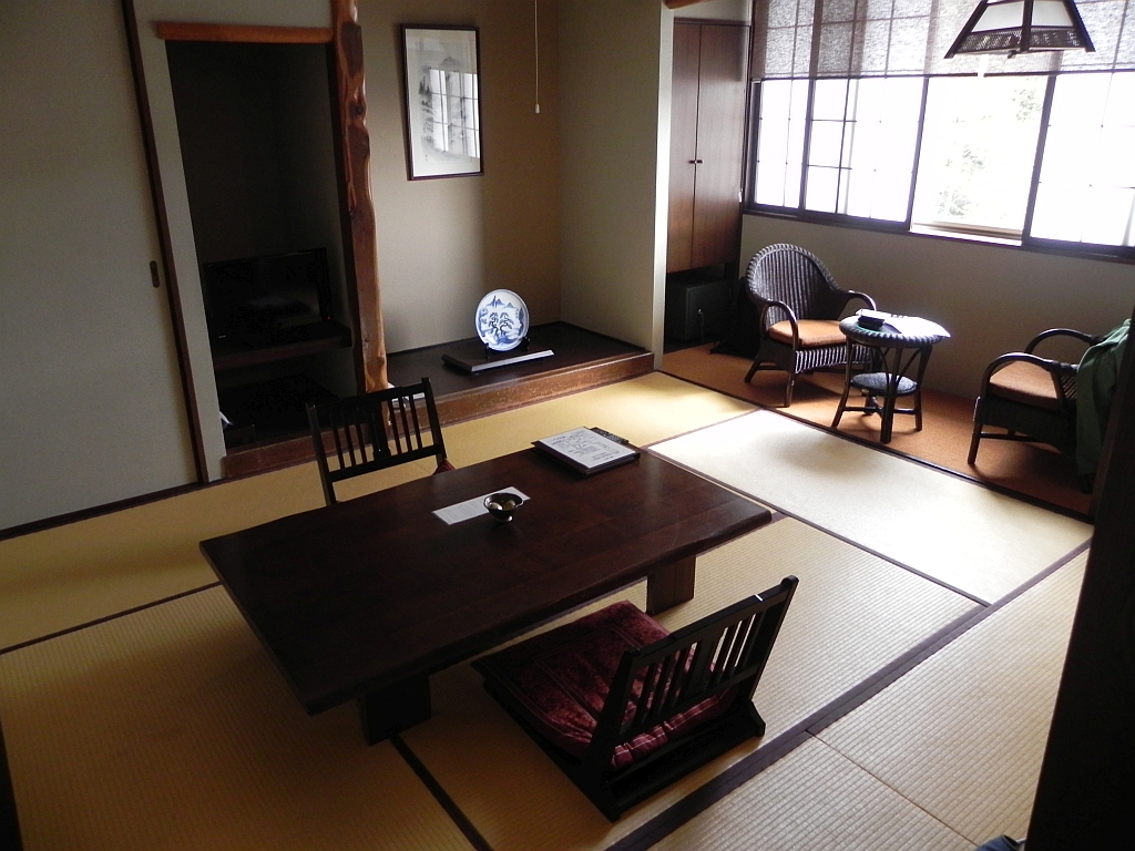 Das Zimmer mit den Tatami und den Sitzmöglichkeiten (unbequem am niedrigen Tisch oder bequem am Fenster mit Blick in den Wald)