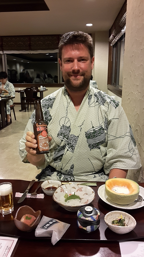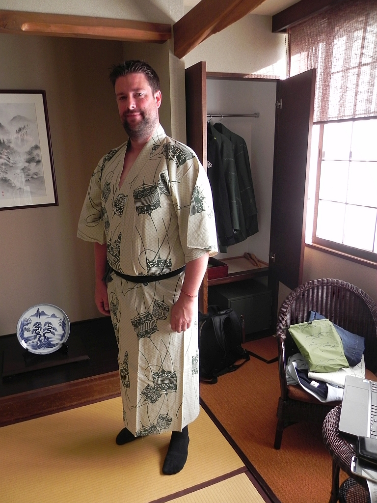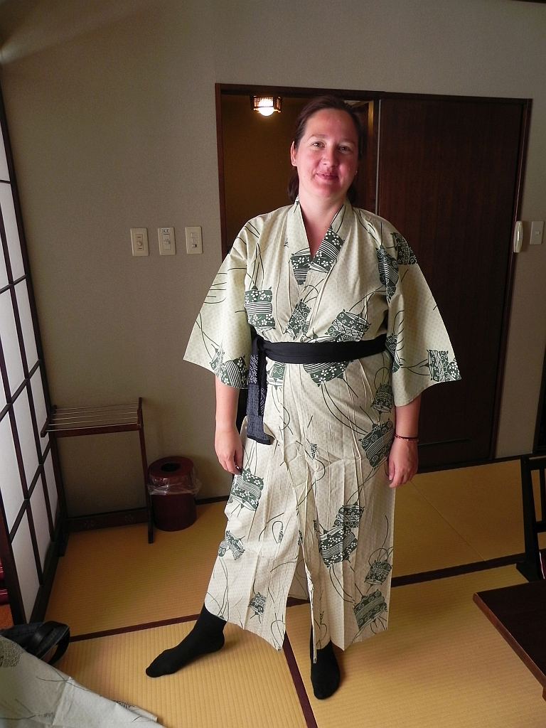 Sobald wir auf dem Zimmer waren: Klamotten aus und Yukata an. Wichtig: Erst rechts einschlagen und die linke Seite darüber. Bei Leichen macht man es anders herum.