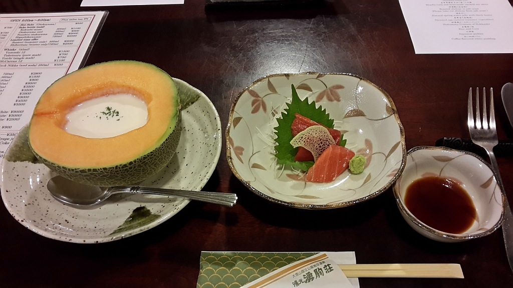 Zuerst eine Kartoffelsuppe in einer Melone (sollte man zusammen essen – sehr erfrischend und lecker) – dazu Sashimi.