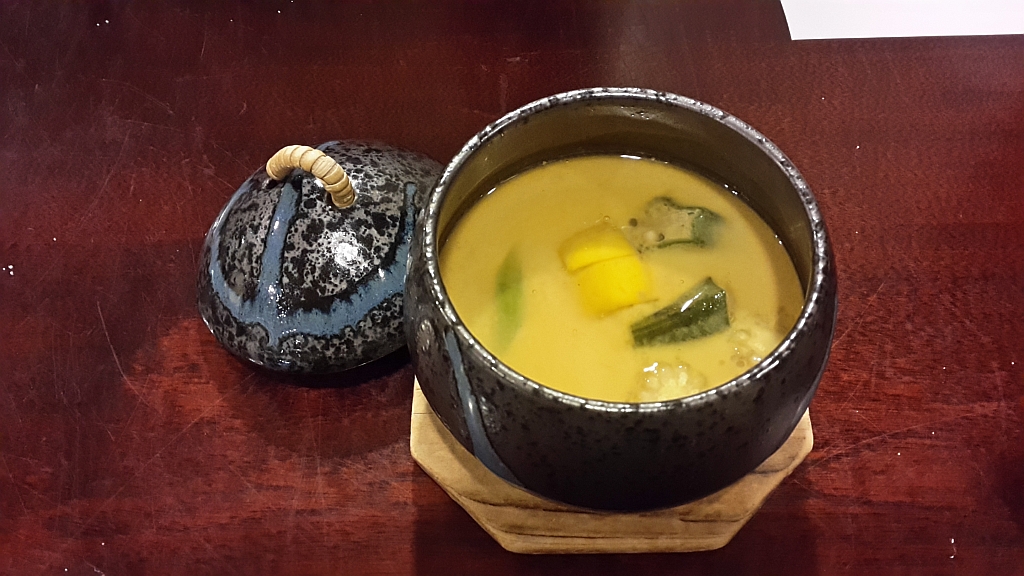 Eine Art „Gel-Suppe“ mit Okraschoten und Kürbis drin
