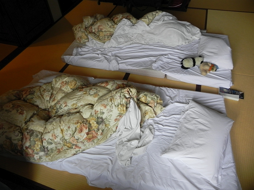 Und während dem Essen werden die Futons vorbereitet und man kann direkt reinfallen und schlafen. Oder eben noch ins Onsen gehen oder sonstwas – wir sind mehr oder weniger direkt eingeschlafen. Hier ein Foto von unseren Schlaf-Futons nach dem Aufstehen.