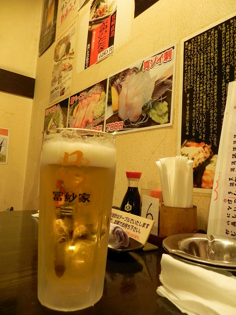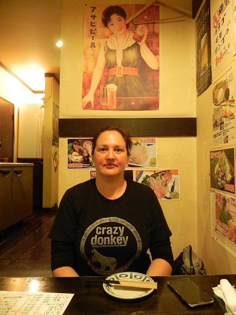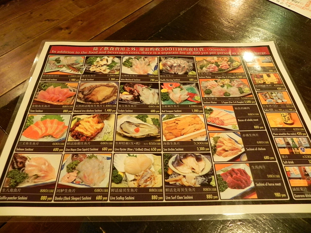 An der Wand war noch ein Getränk abgebildet mit der Internetadresse „HappyHoppy.jp“ oder sowas in der Art. Das haben wir auch bestellt, obwohl uns die Bedienung davon abhalten wurde. Im Grunde war es ein Schnapps mit Soda und leicht nach Hopfen schmeckenden Wasser. Interessant aber auch nicht wiederholungs-würdig.